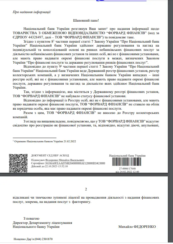 2. Відповідно до інформації із Реєстру осіб, які не є фінансовими установами, але мають право надавати окремі фінансові послуги, ТОВ “ФОРВАРД ФІНАНСІВ” не ставало на облік як юридична особа, яка має право надавати окремі фінансові послуги.