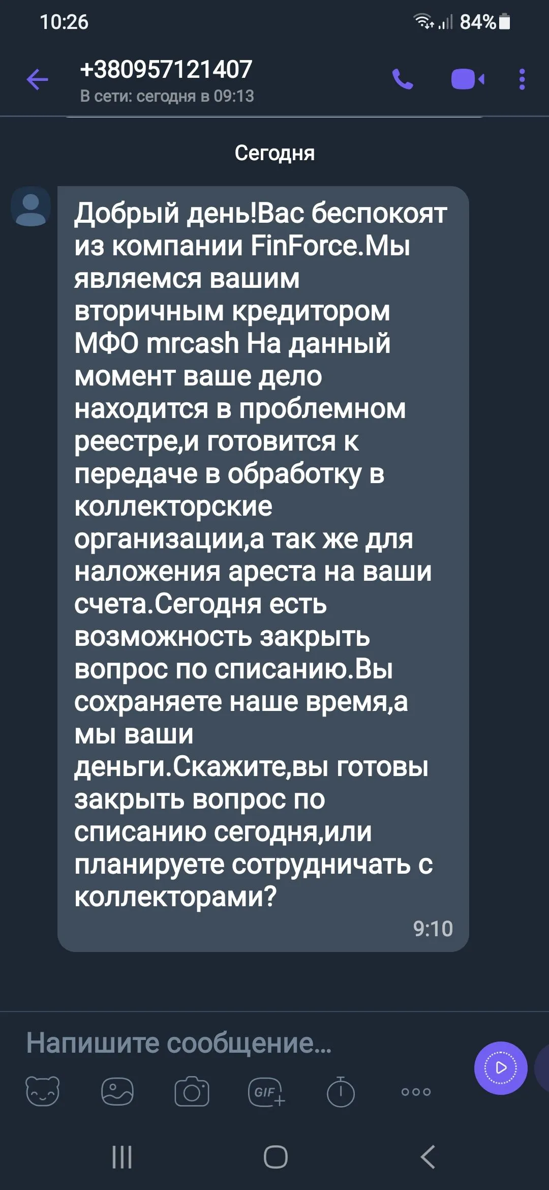 Смс, Вайбер,и прочее не несут никакой смысловой нагрузки.Не верьте вы в магическую силу смс.Увага! КРЕДИТ НЕ ПОГАШЕНО!!!