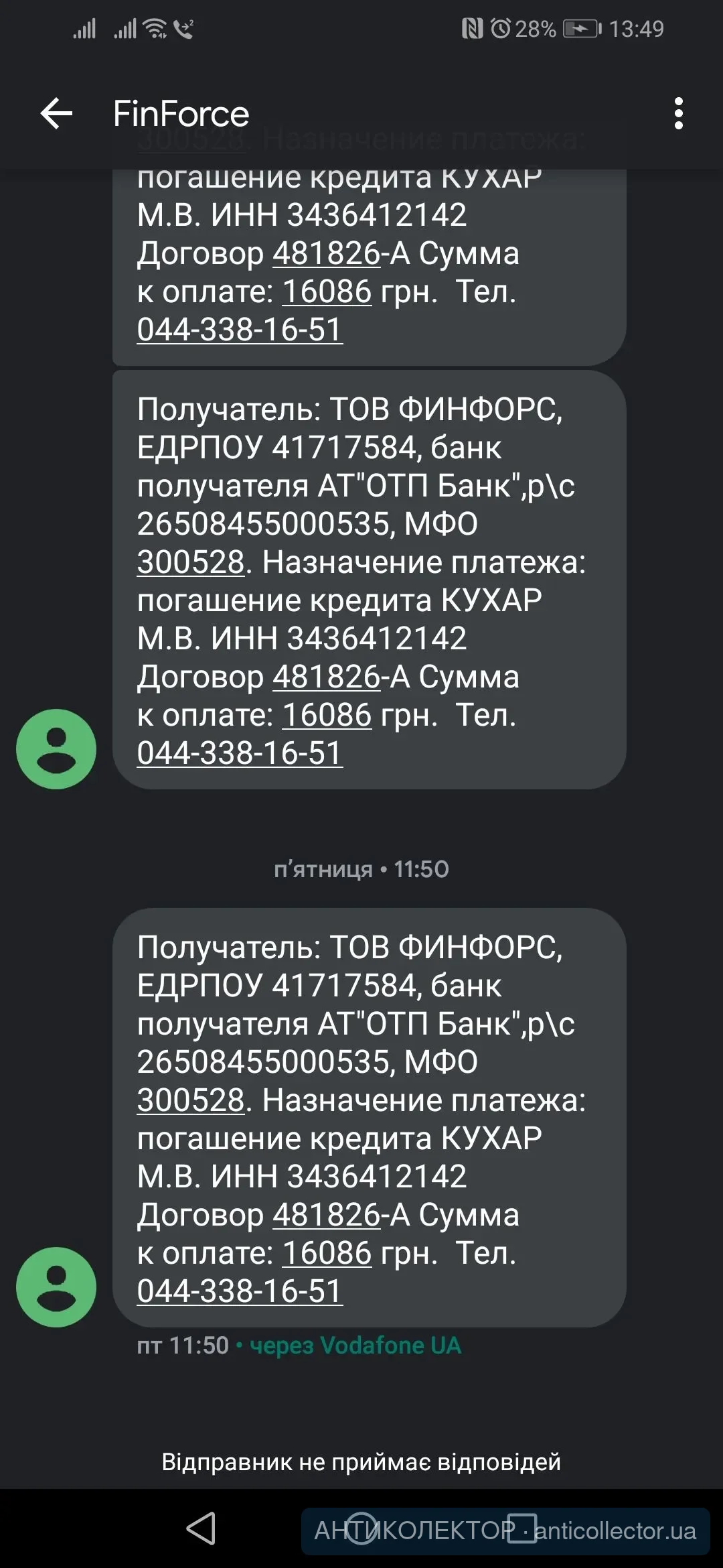 Привет. Несколько дней назад я создавала тему обзванивают всех родителей, знакомых и людей которых я не знаю. Все ето делала ета вонючая компания фин форс. Они добрались до всех. И сегодня мне позвонила мама из Польши и сказала что бабушке плохо, ей звонили ети уголовники угрожали и она ето все в серьез принимает а у неё больное серце. И вообщим они достали и мама сказала что заплатила им 16 000.((((я в шоке!!!! Говорю где гарантии что они далее не будут терорезіровать и вымогать деньги? Где доказательства что долг закрит? Она даже не видела договора, ничего просто из-за етой травли и страха заплатила. Я теперь боюсь что будет волна и все остальние начнут выбывать деньги((