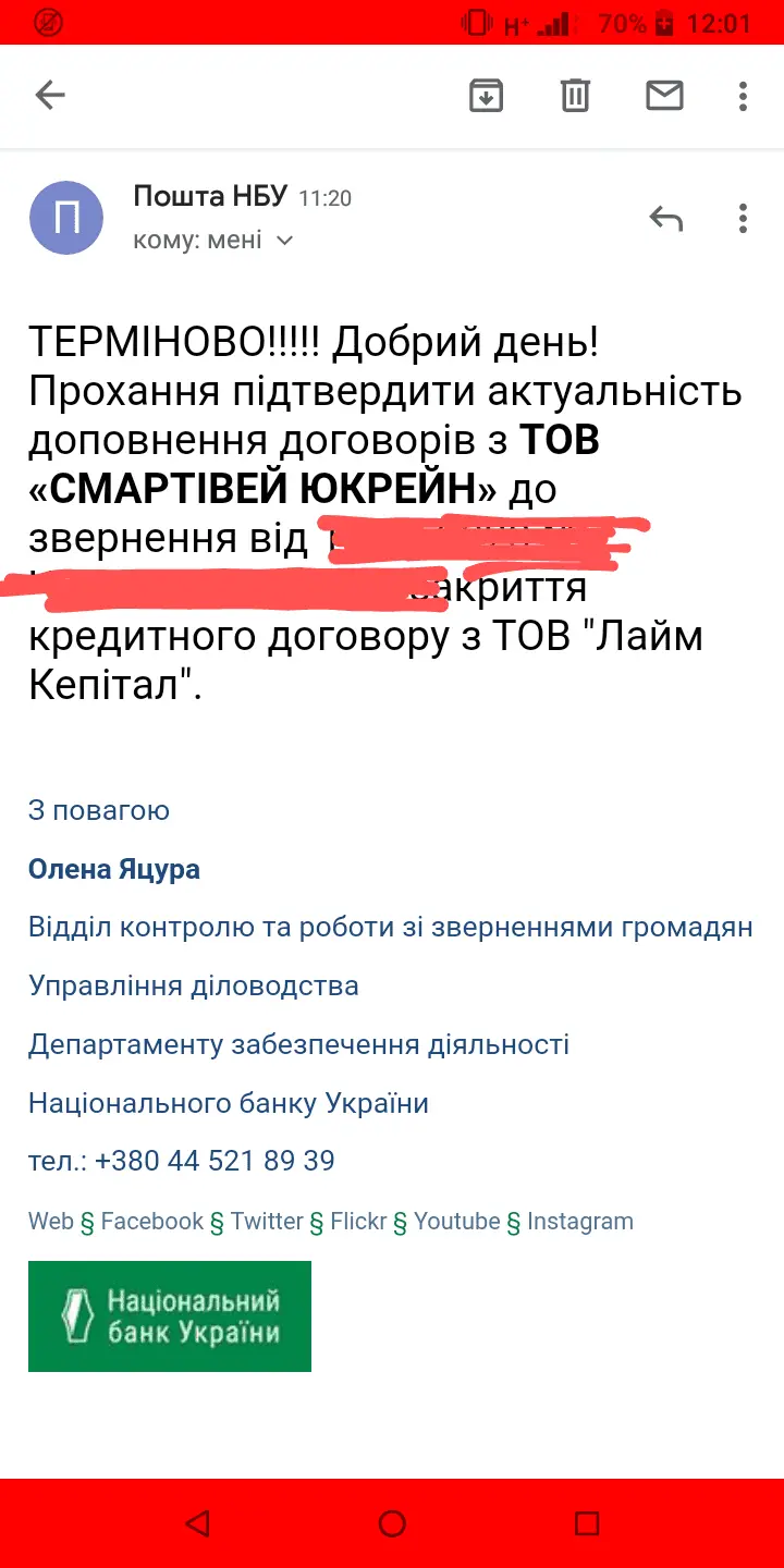 Да пока просто прислали заявление в НБУ, которое я должна переписать, поставить подпись и отправить, после их ответа -сказали будут мне бесплатно составлять заявление в суд.Вашу жалобу направят в фин.учреждение,на которое Вы жалуетесь, судя по информации на данном сайте. Результат обращения, по-моему, очевиден...