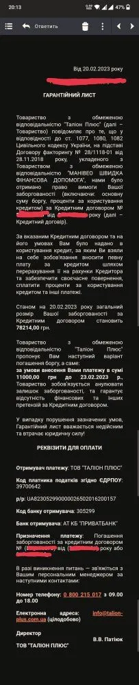 Попросіть у них нормального листа. Мені вони спочатку також тільки текстом скинули,без підпису і печатки. Написав їм,щоб оформили нормальний лист. Через годину відправили. В п'ятницю їм заплатив. Вчора отримав довідку про закриттяДобрий вечір. Сьогодні на пошту прийшов лист від Таліон+, який вони назвали гарантійним. Печатки та підпису немає. Чи можна його вважати таким?