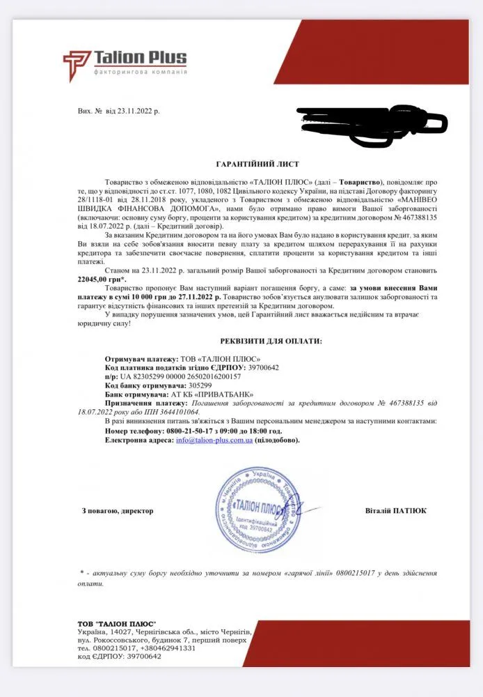Добрый день, подскажите был кредит в манивео вчера пришло смс от талион плюс по поводу закрытия потом они написали мне в телеграмме закрыть кредит на выгодных условиях за тело попросила гарантийку прислать и договор факторинга гарантийку прислали за договор молчат пишу манивео те говорят чтоб талион писала они пришлют