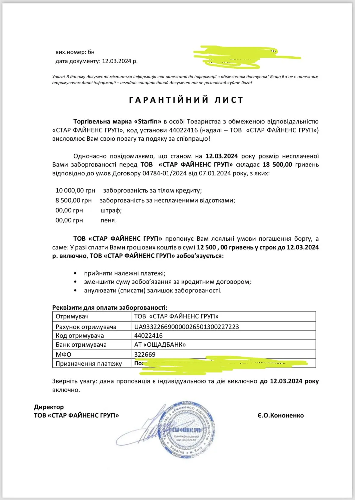Здравствуйте, предложили закрыть кредит за сумму меньше и скинули гарантийное письмо в телеграмм. Его можно считать нормальным?