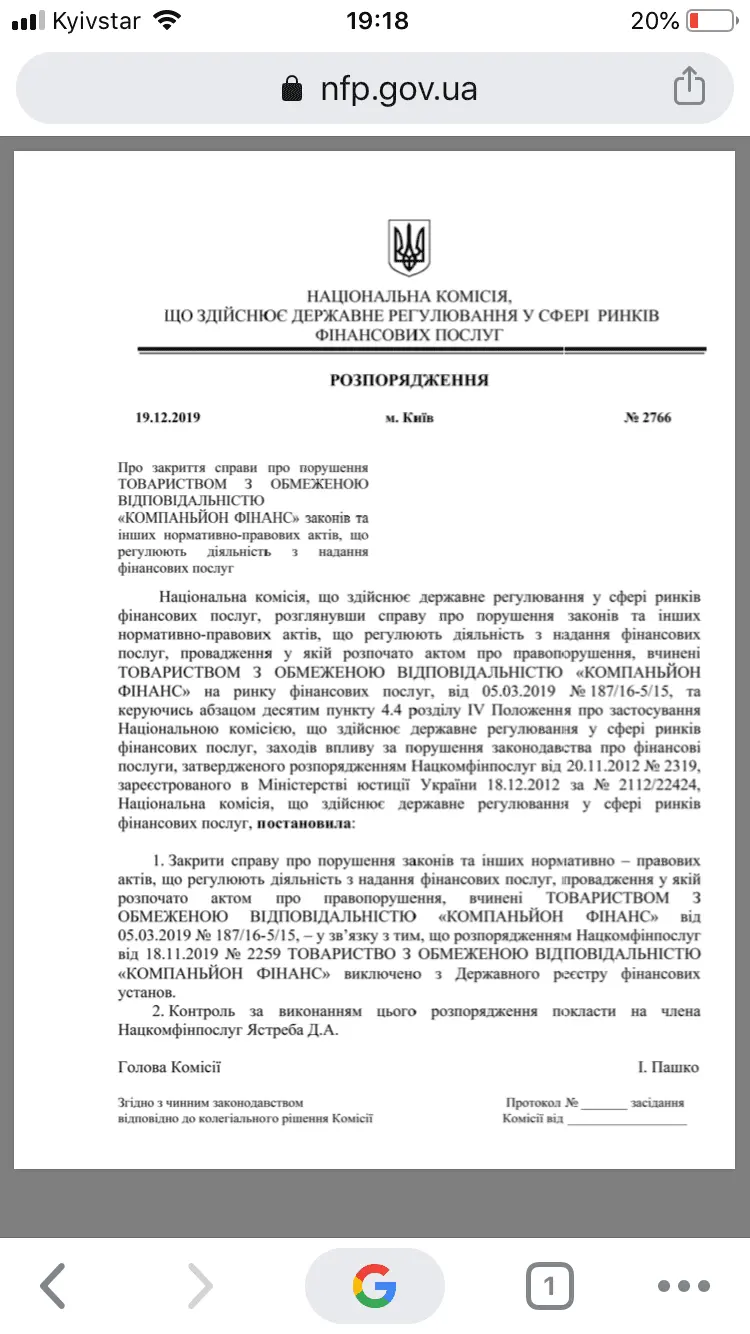 Что здесь хорошого??? Написано же , закрити справу , а не компанію це ж не заборона на надання фінансових послуг.Сьогодні прочитала на сайті нацкомфінпослуг)