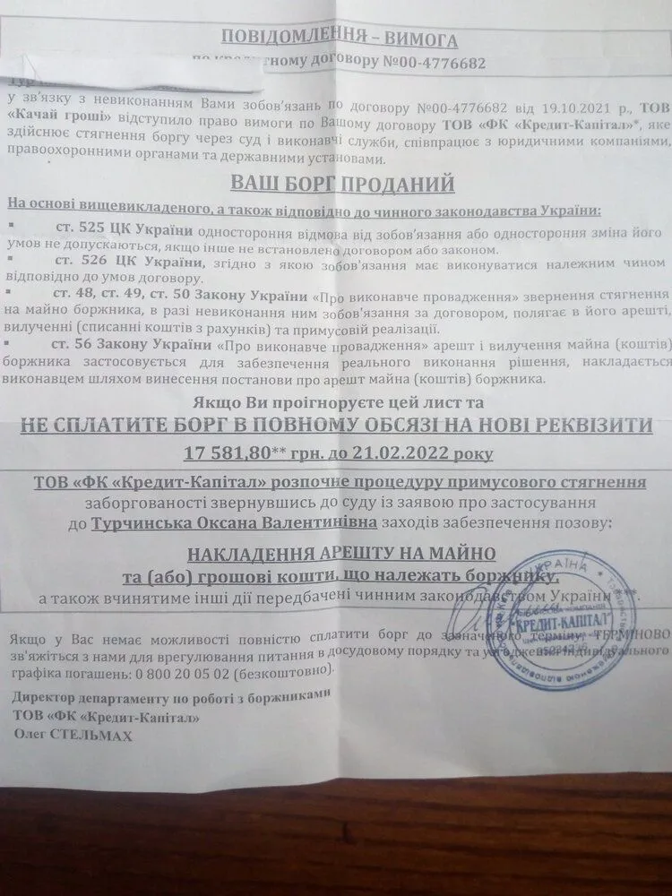 Доброго дня!Три дні тому мені прийшов лист додому,що компанія Качай гроші продала мій кредит(Кредит Капітал).Вони мені передзвонили і дали срок до 4 лютого 2022 внести всю суму 17581.80 обов'язково якщо не хочу проблеми і залишитись без майна.Брала я в Качай гроші 6000 .Був в мене і ще не один кредит але змогла з багатьма домовитися і закрити без проблем і з гарантійними листами,з ціми не можливо навіть розмовляти не дають сказати навіть слова.На даний момен записую всі розмови.