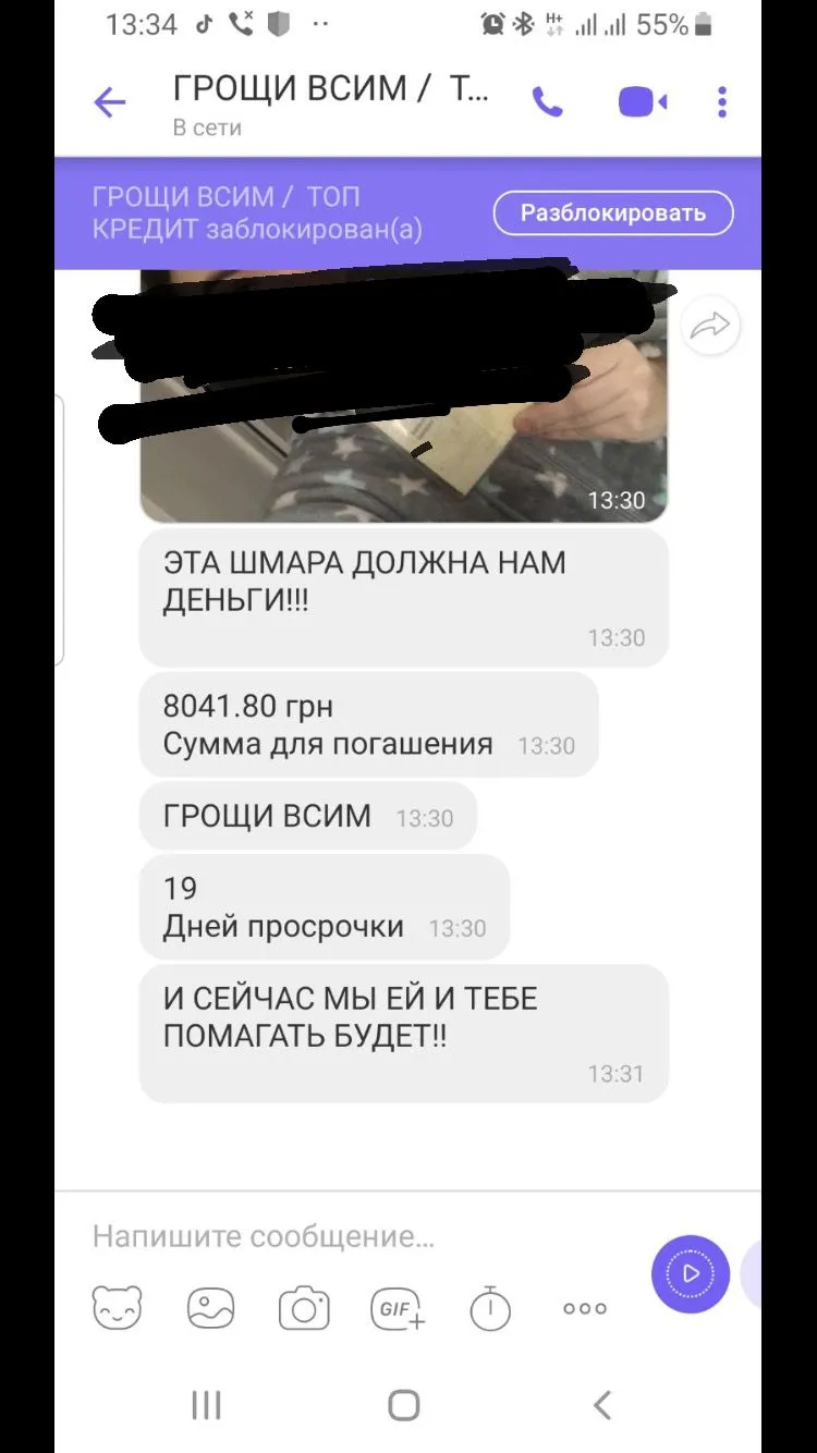 І реально розсилають всім колажі?Ну конечно,когда прострочка они подключают,то Олегов,то Артуров,которые хамят в вайбере и говорят буду гасить семью,а также пишут номера начальства и всех сотрудников и родственников,если не заплатишь будут жестко хамить им и доставать.Уже ето проходили.А сама компания говорит,нет у нас таких сотрудников))))