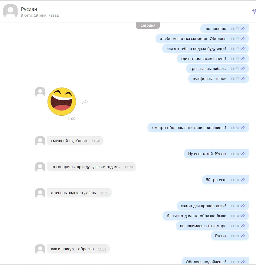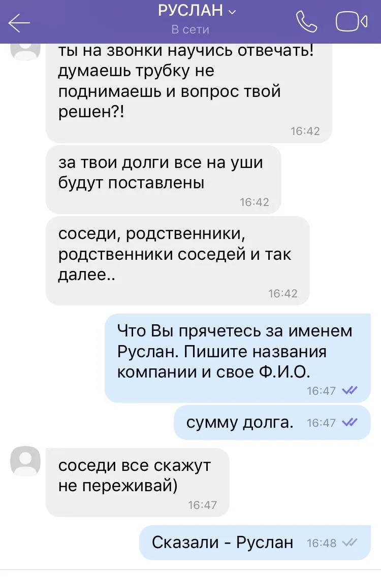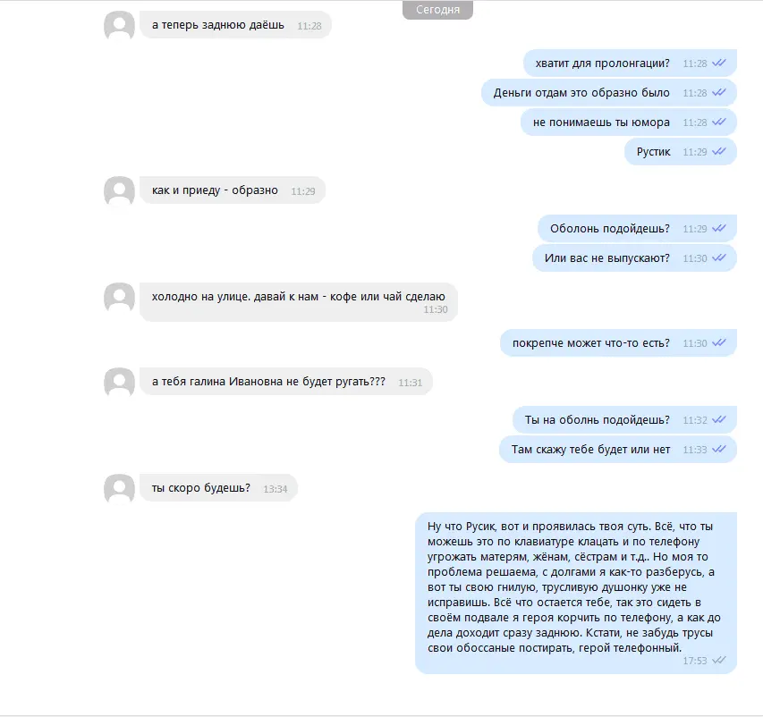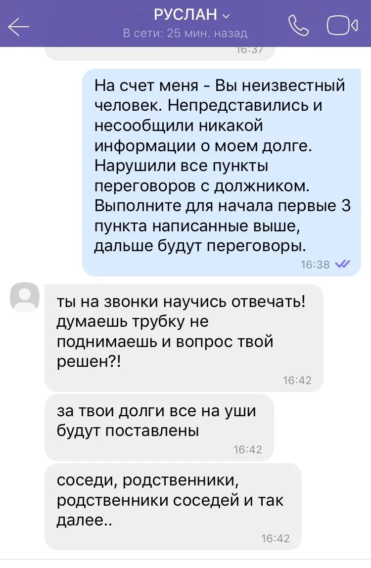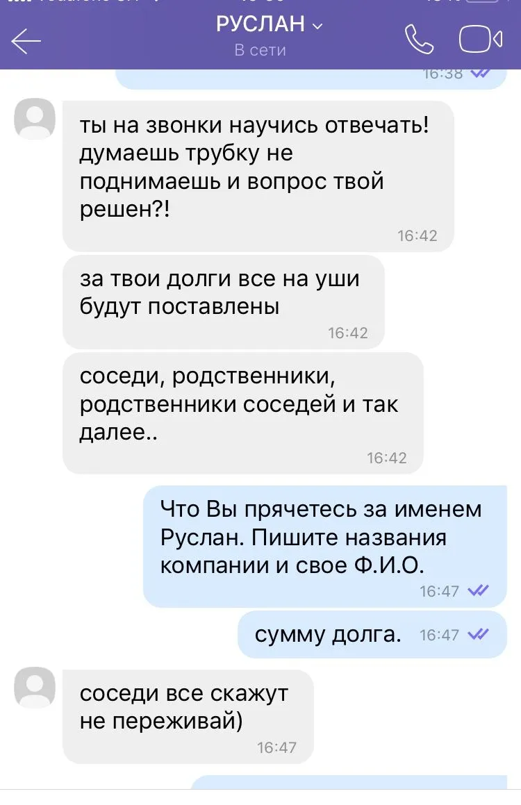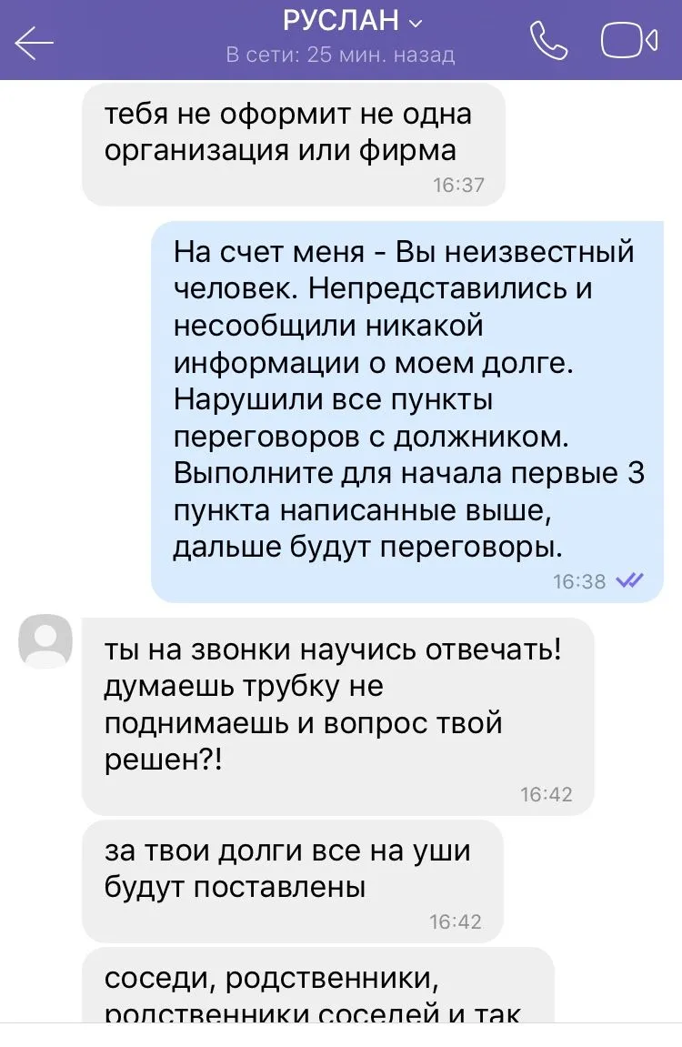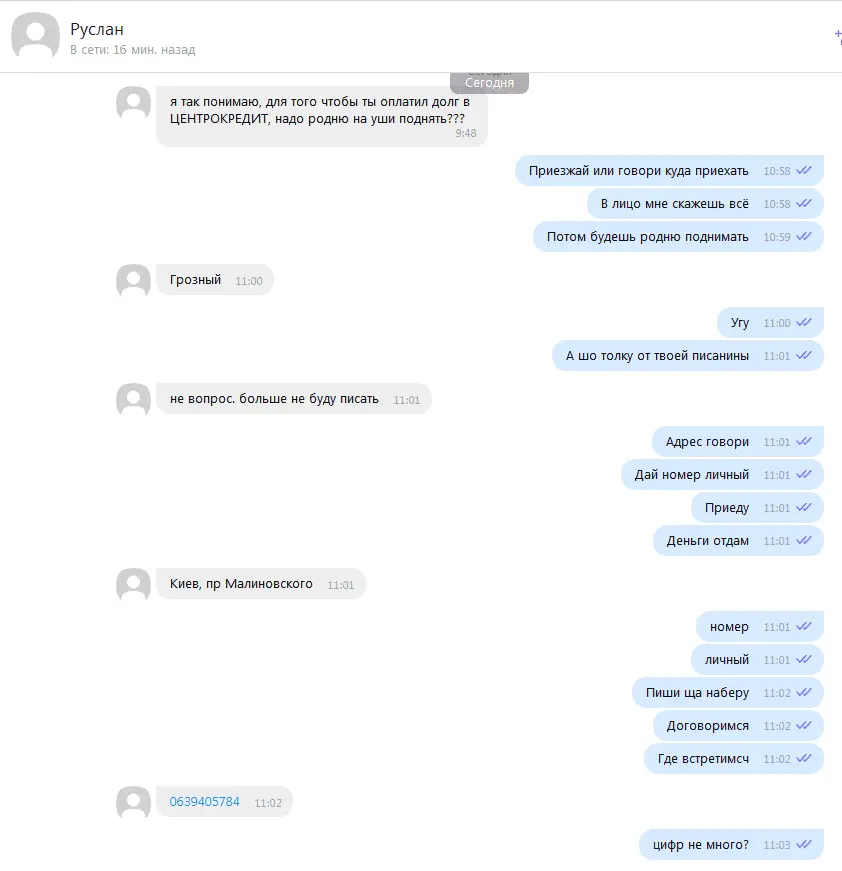 Всем привет! Решил поделиться с вами веселой историей которая сегодня со мной произошла. Написал утром персонаж по имени Руслан из ЦЕНТРО кредит, мол будет ставить моих родсвенников на уши, чтоб помогли вернуть долг. Я ему предложил встретиться, тот согласился. Но как оказалось, Руслан не такой уже и грозный каким казался по телефону, на месте его не было. Так что ребята не бойтесь, что к вам кто-то приедет, они даже не приходят когда ты к ним приезжаешь. Скрины переписки прикрепил.
