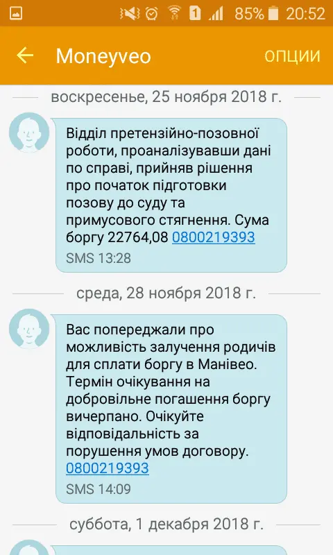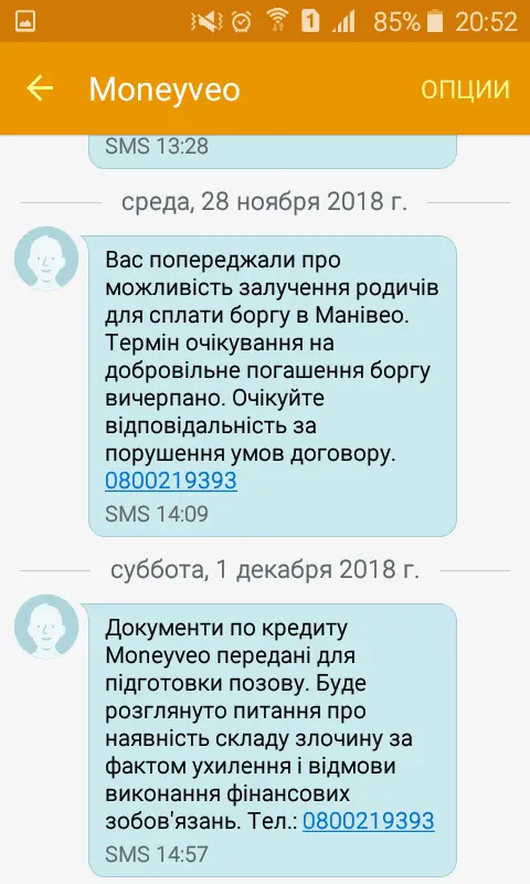 Вчера позвонило "оно", сказало что покупает мой долг в Манивео! Типа частное лицо, и теперь я должна ему буду 90000!!!! При теле кредита 10000! Сказало что столько стоят эго услуги! Оно не представилось, тел.0634050985, может єще кому-то оно звонило???