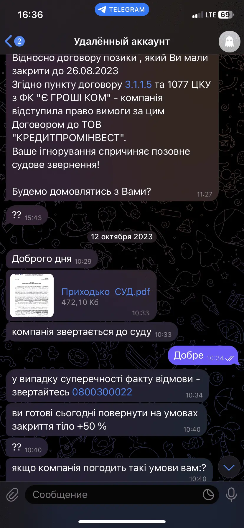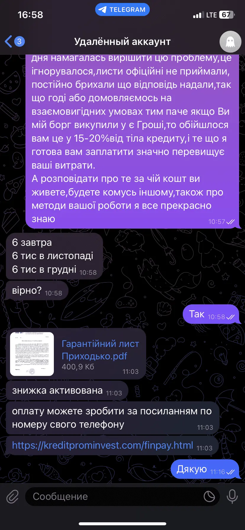 Хотя я до просрочки да и во время нее пыталась договорится как с егрошима так и с кредит проминвест предлагая оплатить тело и %до просрочки почти 18 тысяч, они морозились. Потом притихли, а дальше в скринах