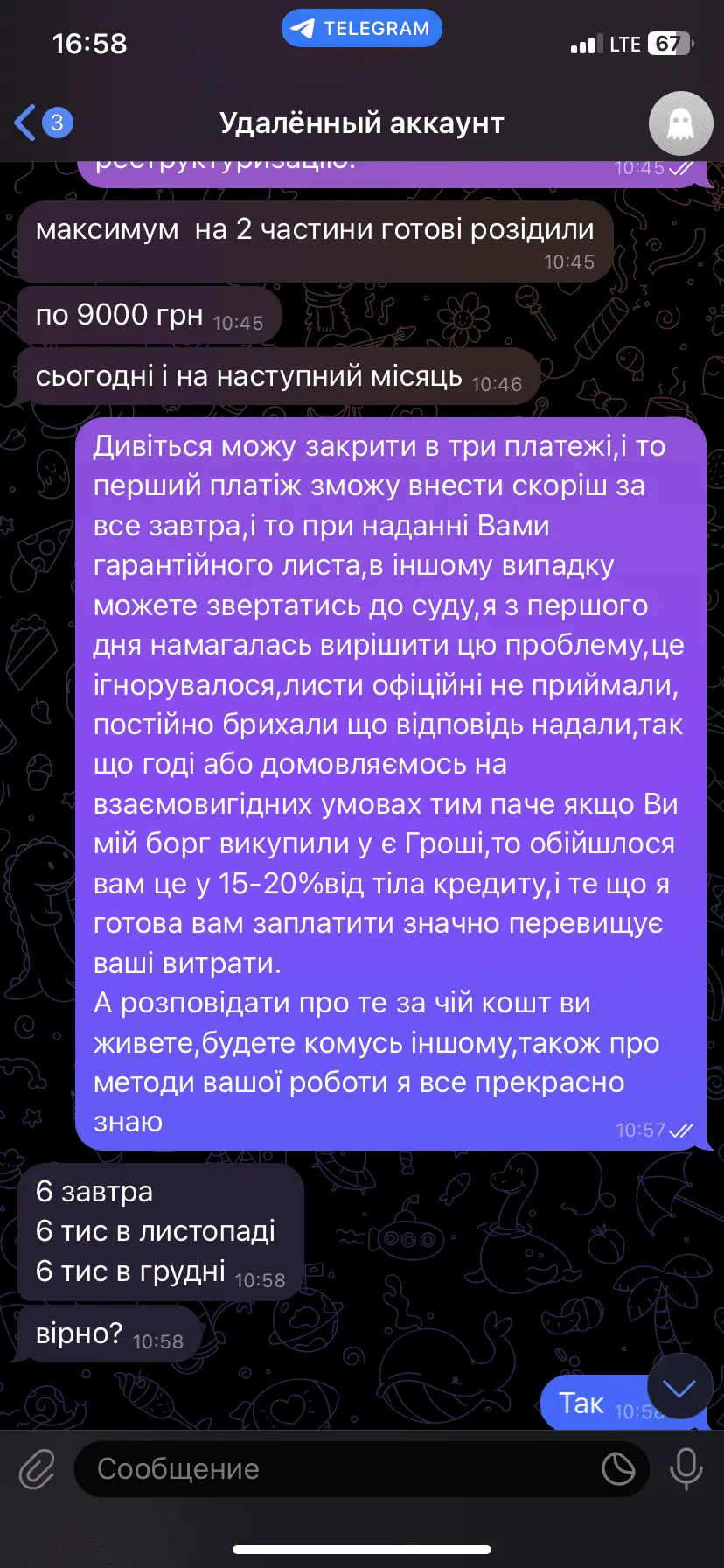 та підвальним поx*ру хто там на якій посаді, проти них працює тільки повний ігнорЯ всех близких предупредила. Писала уже не раз, их действия не законны и написаные циферки тоже. Это ж где такое видано, что на тело 7500 грн отдать 14500. Это без просрочки с колом в -60%? Отдам то, что брала и то, когда насобираю. Это вообще беспредел. Хотя пусть позвонят по контактам. Там один кум в ТЦК работает, подруга адвокат, знакомый в район райотделе полиции работает. Может на них нарваться и перестанут наяривать))))