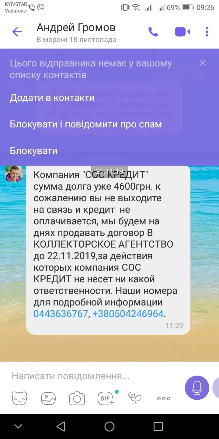Мені таке приходило тричі за 2місяця прострочки від кредит+-небуло,а от видзвонюють жахливо рідних сусідів даже сільську раду,як побачили,що без толку.А ще погрози у вайбер від якогось Громова і що дітей заберуть.Я б їх розстріляла.