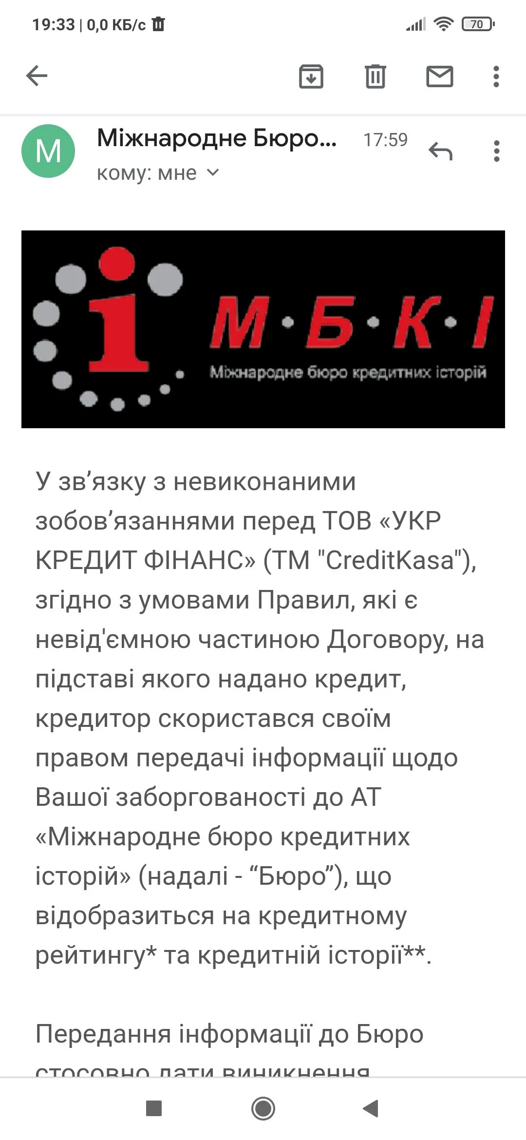 У зв’язку з невиконаними зобов’язаннями перед ТОВ «УКР КРЕДИТ ФІНАНС» (TM "CreditKasa"), згідно з умовами Правил, які є невід'ємною частиною Договору, на підставі якого надано кредит, кредитор скористався своїм правом передачі інформації щодо Вашої заборгованості до АТ «Міжнародне бюро кредитних історій» (надалі - “Бюро”), що відобразиться на кредитному рейтингу* та кредитній історії**. Передання інформації до Бюро стосовно дати виникнення прострочення зобов’язання за кредитним правочином, його розмір і стадія погашення передбачено частиною другою статті 9 Закону України “Про організацію формування та обігу кредитних історій”. Рекомендуємо чітко виконувати ваші зобов’язання для збереження високо рівня кредитного рейтингу та збереження довіри кредиторів. *Кредитний рейтинг - числова оцінка якості кредитної історії, на яку спираються кредитори під час ухвалення рішення про видачу нового кредиту. **Кредитна історія - це сукупність інформації про юридичну або фізичну особу, що її ідентифікує, відомостей про виконання нею зобов’язань за кредитними правочинами, іншої відкритої інформації відповідно до Закону України “Про організацію формування та обігу кредитних історій”, що міститься в базі Бюро. АТ МБКІ Контакти 03117, Украина, г. Киев, пр. Победы, д. 65, оф. 306 т.: +38 (044) 228-33-92 e-mail: [email protected] https://credithistory.com.ua/ |