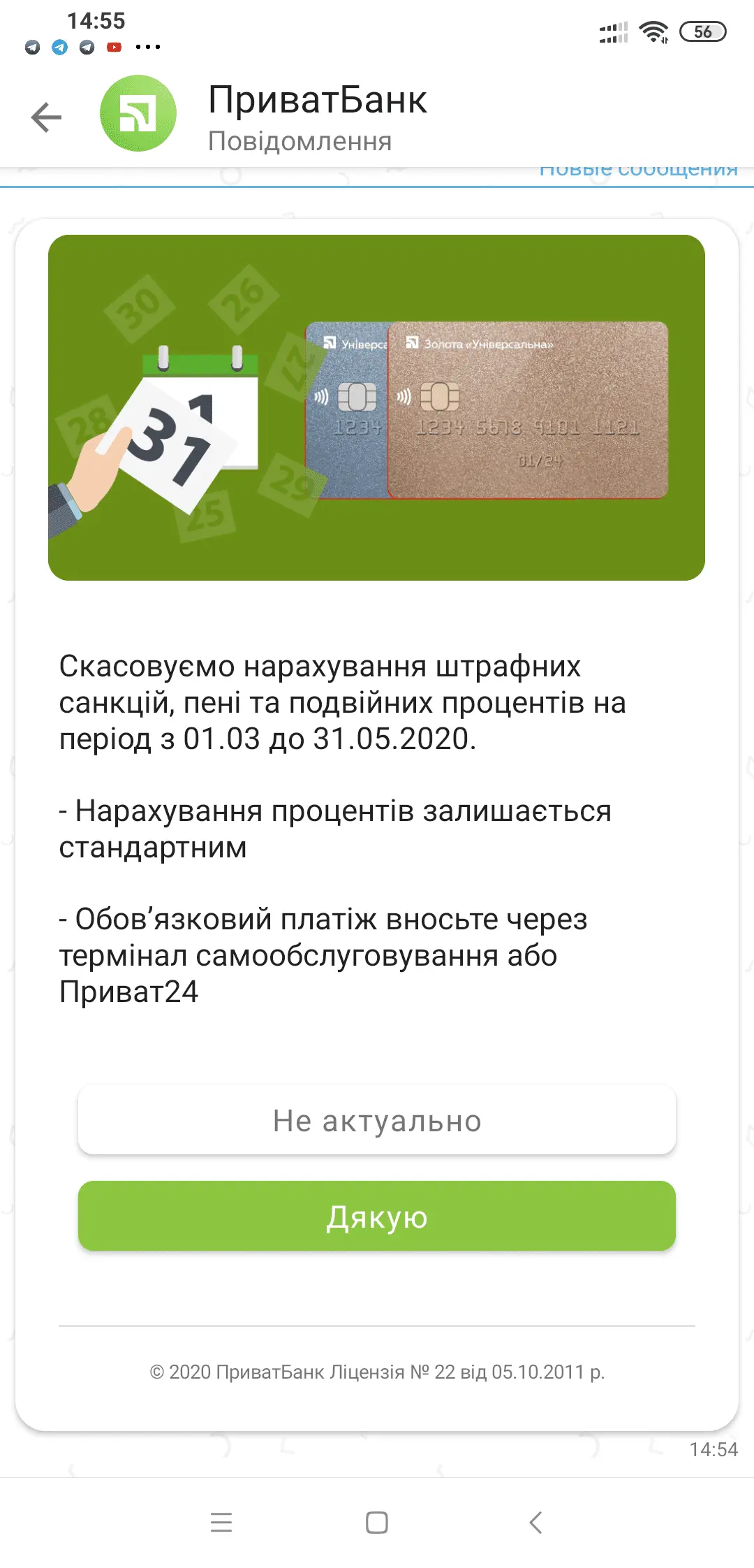 А як цє? Подвійних процентів. Чого не потрійних?Только что пришло сообщение. У Привата карантин до конца мая