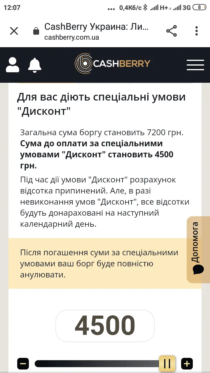 Доброго дня.Сьгодні прийшла смс про списання від кешбері .Пролонгації не робила ,прострочення 38 днів ,тіло 3000 нарахували 7200 пропонують за 4500 .От незнаю чи погодитися на пропозицію??
