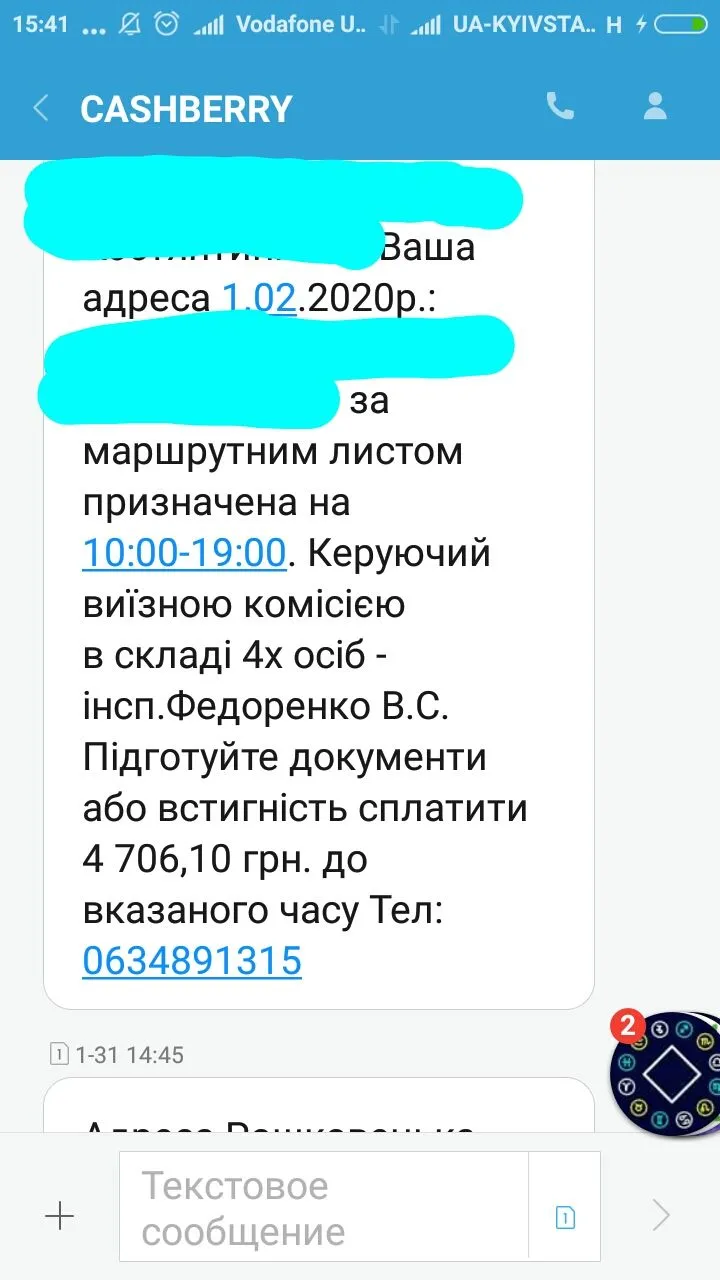 ! Ваша адреса 1.02.2020р. за маршрутним листом призначена на 10:00-19:00. Керуючий виїзною комісією в складі 4х осіб - інсп.Федоренко В.С. Підготуйте документи або встигність сплатити 8 900,00 грн. до вказаного часу Тел: 0634891315