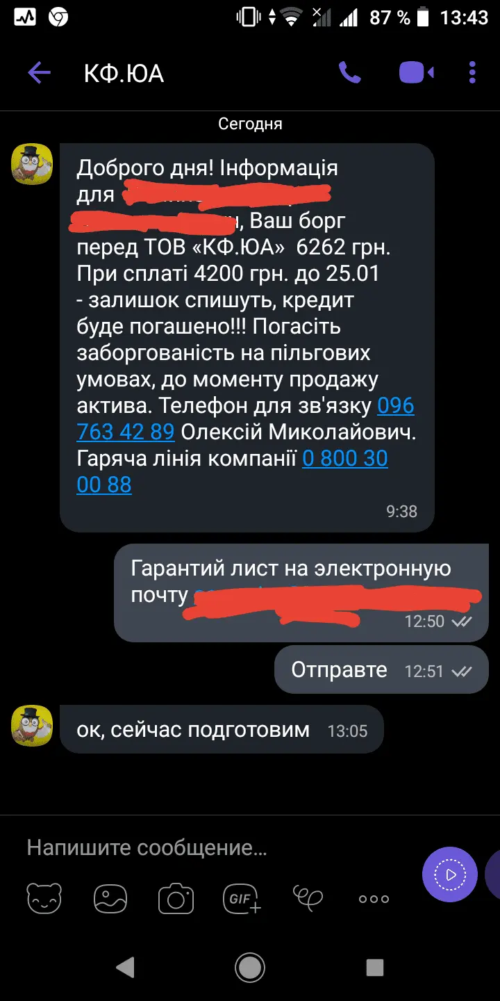 Мне тоже на прошлой неделе пришло смс с предложением закрыть за тело,позвонил на горячую линию,спросил правда ли,сказали что заявку подали,ждите с Вами свяжутся,на следующее утро прислали в Вайбер и на эл.почту гар.лист и попросили после оплаты сообщить чтобы передоли инфу.в бугалтерию на списание,вечером сделал оплату и отписал в Вайбер,минут через 10 пришло смс что я якобы оплатил оставшуюся сумму ,в кабинете проверил,кредит закыт.Просрочка на момент предложения была около 5 мес,не платил вобще ничего,с тела 4340 насчитали 13430Screenshot_2020-01-21-09-57-13.webp