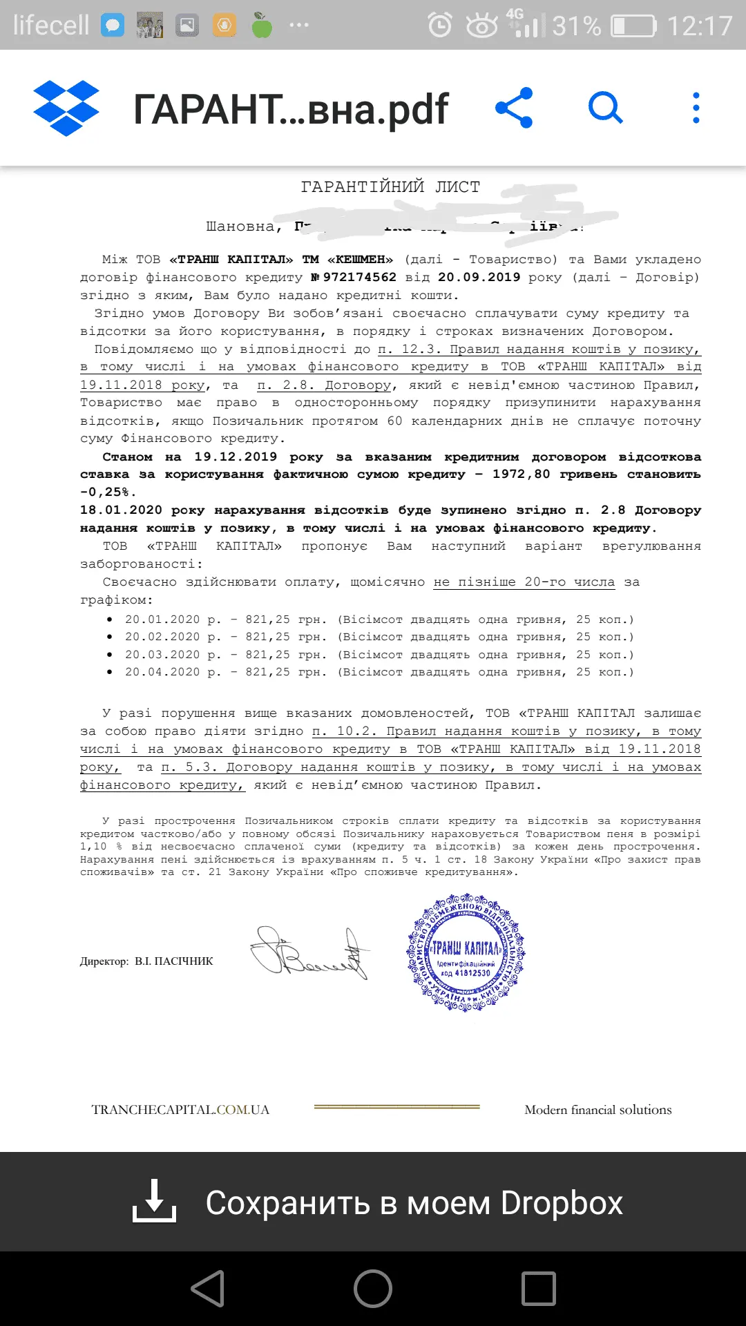 У мене є просрочка в КешМен,особливо не надокучали,не погрожували.Сьогодні подзвонили і запронували мої умови реструкторизаціїї,мої дати платежів.Запропонували самі вислати гарантійний лист.Я їм відповіла,що перший платіж зможу зробити не раніше середини січня,якщо вони порахують тільки тіло+%до просрочки,вони погодилися і зійшлися на 4платежі.Я думаю як би всі входили в наше положення,тоб частіше і кошти свої повертали.