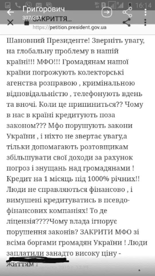 Доброй ночи кто не спит!И доброго утра кто проснулся!Извините что пропала...но были проблемы с телефоном и выходом в интернет.И так по поводу письма петиции к президенту...адвокат сказал...у него есть один варианта...Мы все вначале должны каждый от себя отправить письма во все МФО в которые должны с оповещением доставки к ним...потом отправить в Нацкадминуслуги опять таки за каждого...для того что бы они урегулировали Наши права с ними...потом в полицию по месту прописки...с предоставленой информацией смс с запугиваниями,шантажем,угрозами и фотоколаджами....если там не принемаю то в Прокуротуру Киева...а потом когда у Нас будут на руках и в этих всех интстациях Наши письма...нам можно написать Президенту что мы делаем все законно и у Нас есть подтверждения этому письма,ответы с Нацкадминуслуг,полиции и прокуротуры...тогда по закону от него что то требывать как от Гаранта страны...сами понимаете...на сколько это все затяниться(((((и сколько еще потрепают Нам и Нашим Родным нервы эти...не люди!!!И я вообще поняла что это просто не реально сделать...Либо...Давайте Сами просто под капирку не будем кидаться умными словами...но за то гурьбой хоть что то Ему напишим!!!!