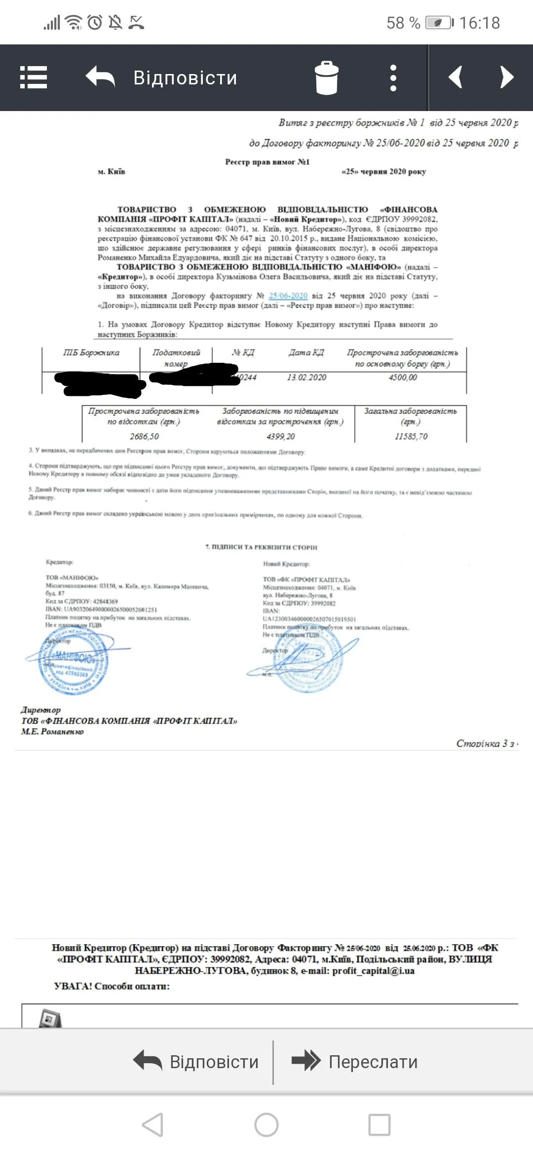 Мне предлагали Новой Почтой (Договор и гарантийку),сказала что бы УкрПочтой с описью вложения,посмотрим,на днях забираю,если будет интересно-выложу,очень важно для меня,хочу оплатитьMAYYA, требуйте договор факторинга в бумажном варианте по укрпоште. Сразу скажу, они готовы вам будут отправить макулатуру типа "договор факторинга", но Новой почтой. Не соглашайтесь.