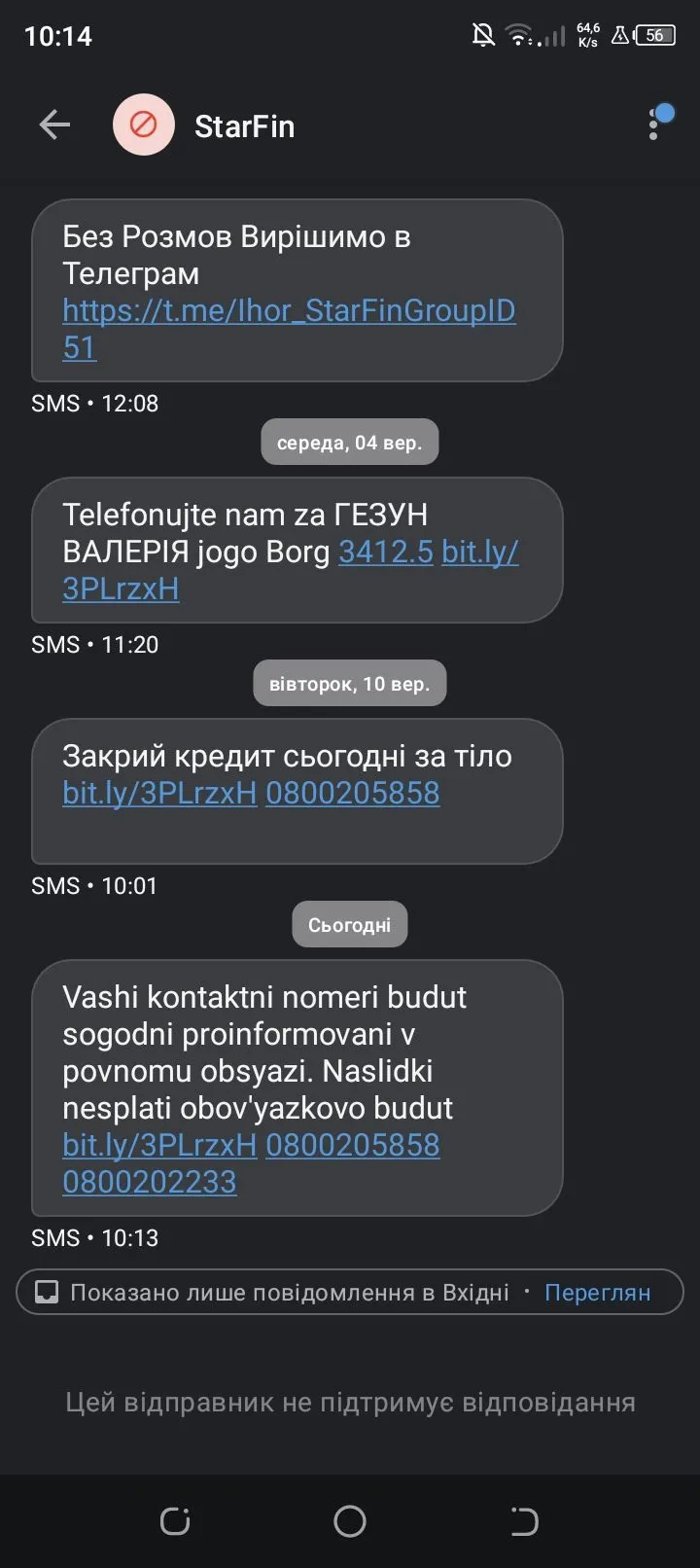 Мені теж прислали, що після 15:00 телефонувати всім будуть. В них пропозиції вперемішку з погрозами. Поки режим сніжинки, так як ні копійки на них немає.вчора таке прислали, сьогодні прислали, що будуть по контактним телефонам телефонувати. поки сан, але думаю і старфін підтянеться.
