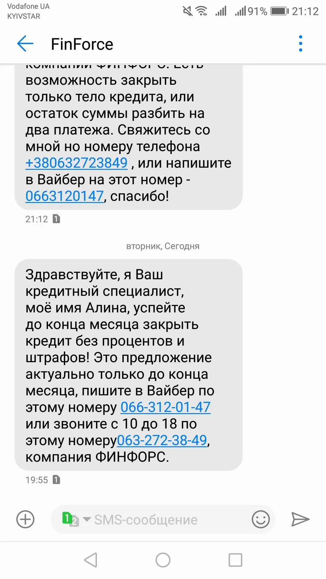 Сегодня прислали с номера 0636968186 в вайбер "Добрый день Ваш борг по "Фінфорс" тепер в роботі приватного виконавця Дорошенко Людмила Володимирівна. Договора переданы ей пакетно, но в обработку она их не взяла, в суд не отправляла. Пока есть шанс отозвать и закрыть за тело, а не за всю сумму + 2500 грн".