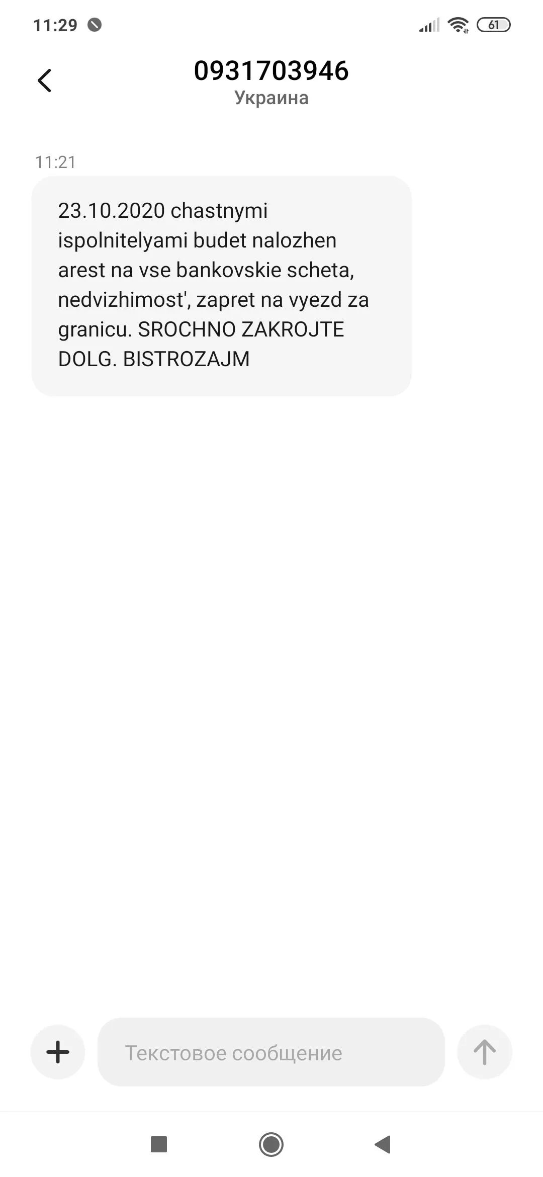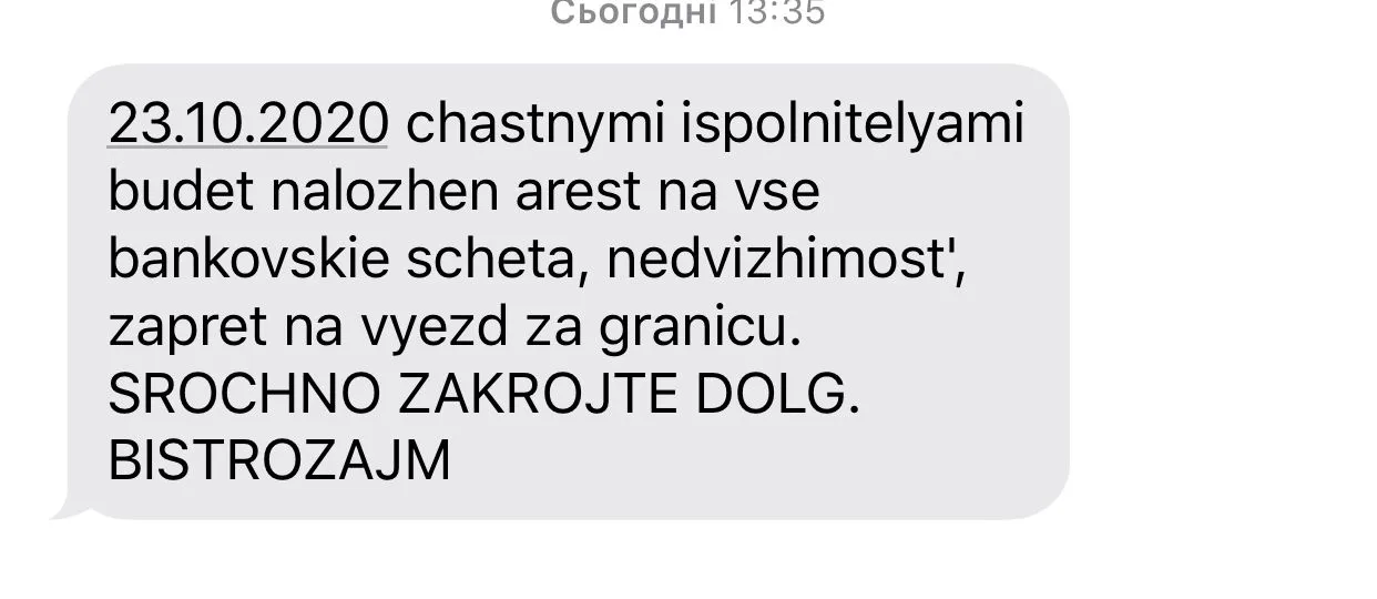 Походу всем шлют сегодня. Мне две подряд пришли.И про меня не забыли 23.10.2020 chastnymi ispolnitelyami budet nalozhen arest na vse bankovskie scheta, nedvizhimost', zapret na vyezd za granicu. SROCHNO ZAKROJTE DOLG. BISTROZAJM