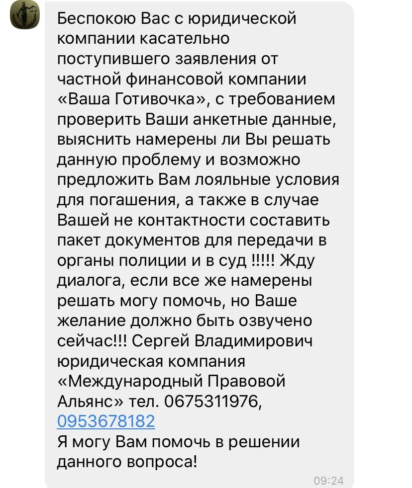 Я спрашивал номер карты для перевода. Сказали заплатить по реквизитам готивочки...Это и есть ваша готивочка, очень любят они полицией грозиться)) у меня даже такое было, что грозились приехать и за приезд им 2000 грн заплатить, внимание - не за кредит, а за приезд!)) а если вдруг двери открыть не посмеюсь, в полицию позвонят. Одного не хватает еще - желтой лентой со словом "преступление" дом оцепить