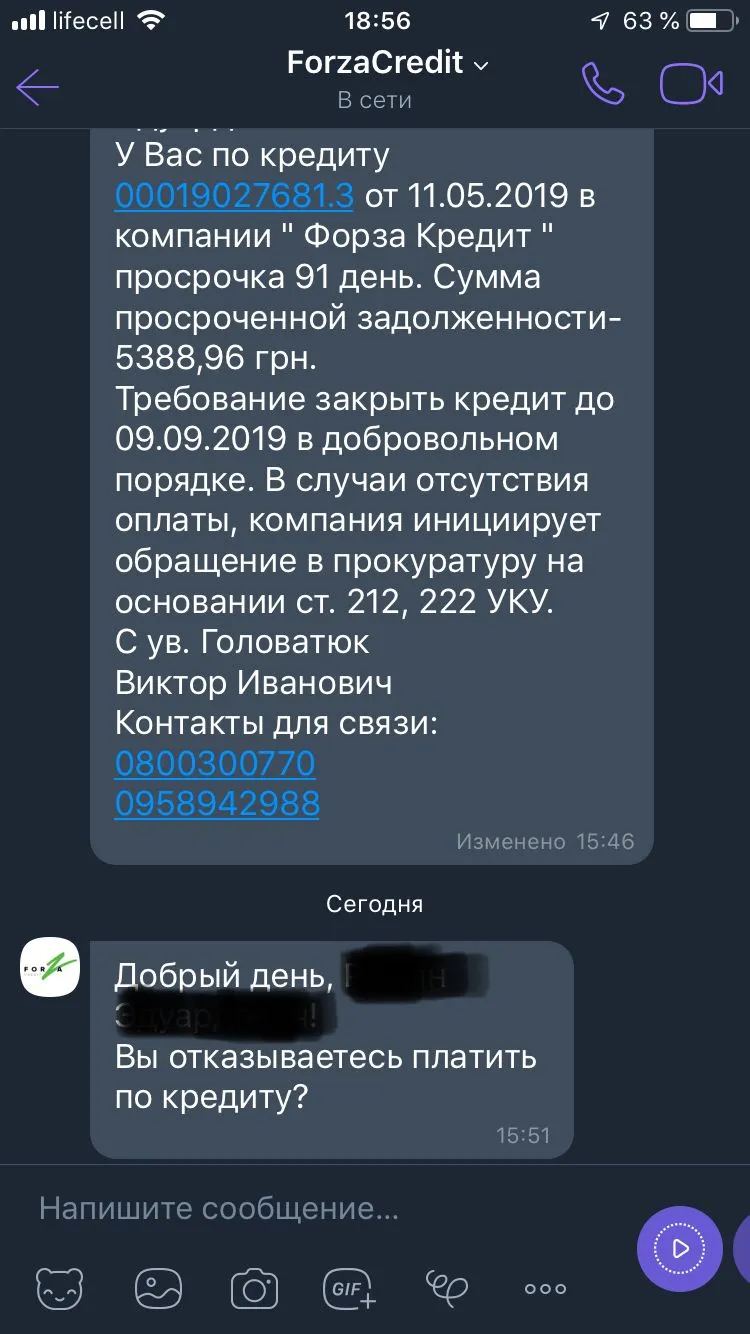 Товариство з обмеженою відповідальністю «Фінансова компанія «Форза» (надалі – Товариство) отримавши Ваше звернення на електронну адресу від 12.08.2019 року, вважає за необхідне повідомити наступне.