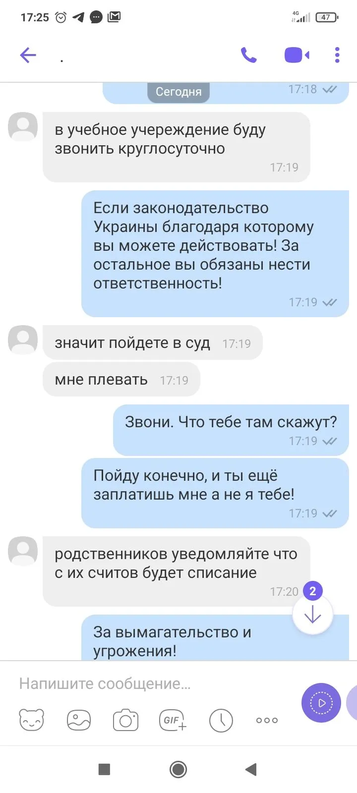 Сегодня вот то что, которое я сначала приняла за бабу, угрожало мне тем что будет звонить сыну в школу круглосуточно, плюс к тому что развесит те фото которые я прикрепила, плюс к тому оно типа не будет нести ответственности за то что коллекторы будут делать, то что будет снимать деньги с родственников как я поняла, плюс соседи друзья, соседи друзья мне честно сказать не сильно важны, а важно чтоб не трогали детей. И они знают чем надавить и сегодня вот вспомнили о школе. А как я сказала что обращусь в полицию сразу удалил сообщение где было указано с какой фирмы оно писало. Блин я просто не представляю, какой мерзостью нужно быть чтоб работать трепая нервы другим...чтоб получать кайф от того что ты унижаешь других... Я себя не считаю шахрайкой... И не буду считать... Я никогда плохо не поступала по отношению к другим людям.. но почему какой то мyдак, даже лицо которого не видно позволяет себе вот так общаться