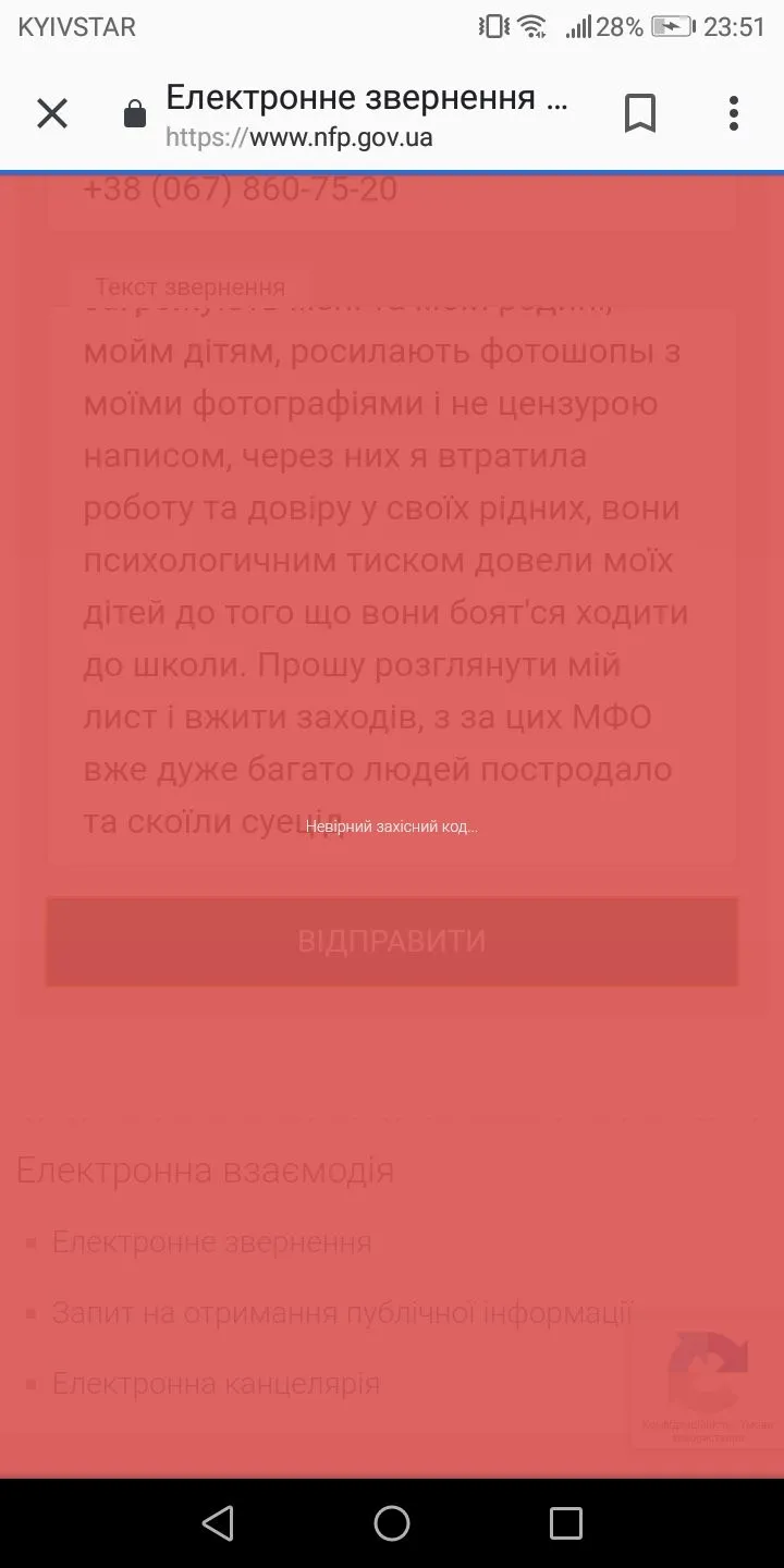 После того как написали обращение, скопируйте текст, обновите страницу, вставьте текст обратно и отправляйте, и будет вам зелёный свет, так делать перед каждым новым обращениемИ мне подскажите как написать в Нацком,я пишу а мне высвечивается красное окно и пишет что неправильный код какой-то.
