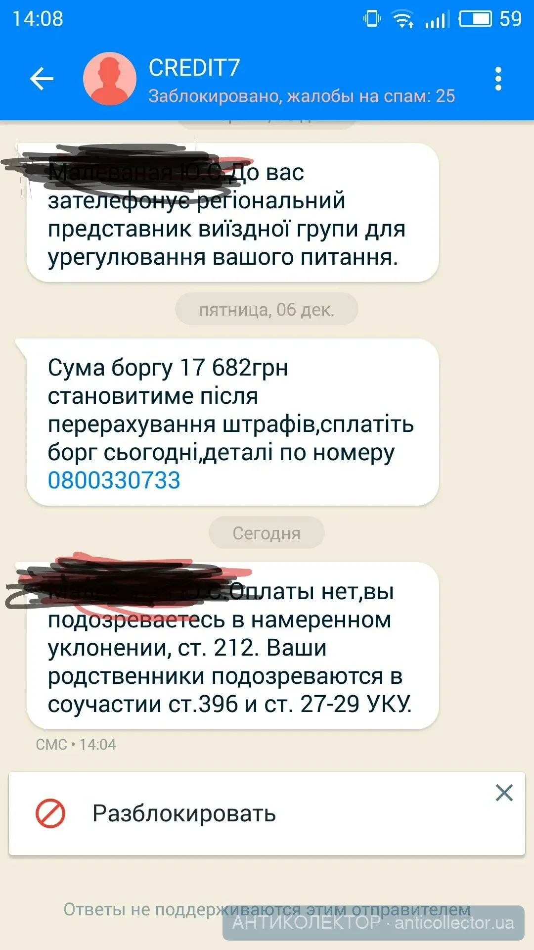В эту среду пришло смс в Вайбер от нерусского с угрозами, потом был звонок от него же, потом звонили из кредит7.Сделала скриншо .нашла в интернете онлайн заявление в гепрокуратуру написала туда и скриншоты добавила, вызвала наряд полиции, они посмеялись и посоветовали отдать долг, но заявление, в котором были телефонные номера приняли. А еще есть сайт с электронной почтой уповноваженно по правам человека ,туда тоже можно написать и скриншоты отправить, я так и сделала.Сегодня маме пришло сообщение с матами, что зах...рю топором и т.д. пробив номер в Гугле нашла комменты, что это кредит 7. Переходят все границы....
