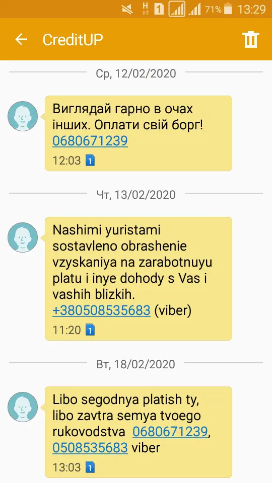 О, у меня вот в марте год вроде как просрочка. Сегодня маме звонили, год никому не звонили, наговорили что у меня долгу 7к, типа до 20 не оплачу, в суд подадут, там тело фuгня была, грн 300может. *****. Мама кипишь навела. Теперь мне интересно звонят ли они на работу. Я официально работать начала(Они у меня уже больше года,активировались,месяц уже пишут СМС,может звонят я на звонки не отвечаю.До этого вообще о них забыла,думала и они забыли))))