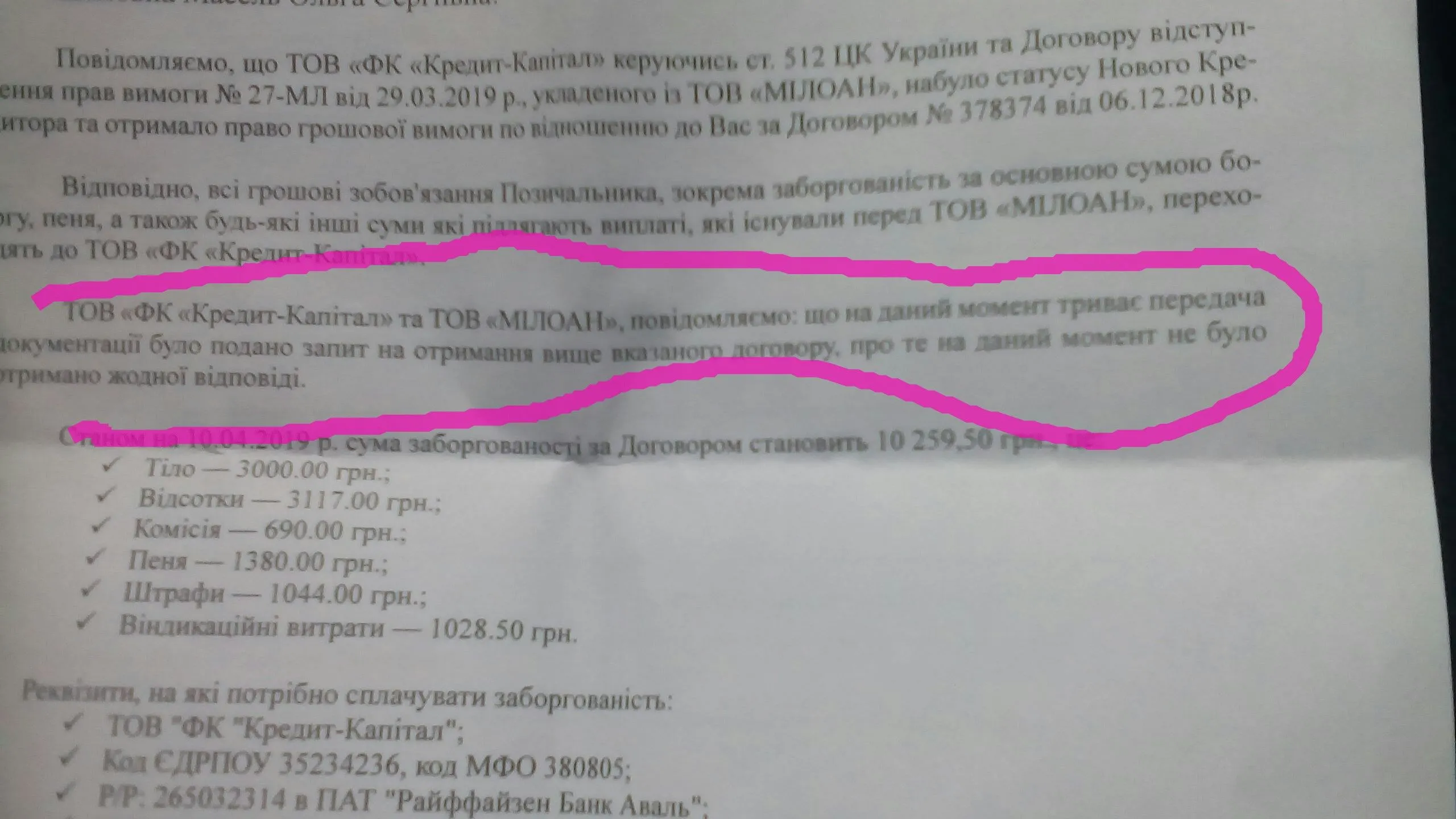 По кредит кассе у меня уже дней45 а милона была3 месяца и 29.03 продали кк бандюганам без адреса. Что это за организация что письма шлет а обратный адрес а/с?В мене мисяць прострочка кошного дня звонять мени брату чоловику.