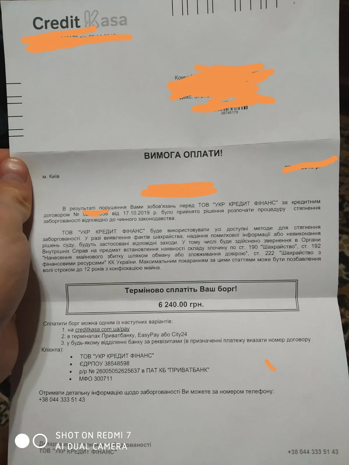 | | В результаті Вашого небажання сплатити борг за кредитним договором № 1234112 від 17.10.2019 р. та ігнорування наших неодноразових письмових вимог, ми будемо вимушені звернутися в державні органи за захистом порушених прав кредитора (ст.16 ЦК України). На цій стадії роботи, ТОВ «УКР КРЕДИТ ФІНАНС» підготував позовну заяву до суду. | Передача заяви до суду буде вимагати від Вас: