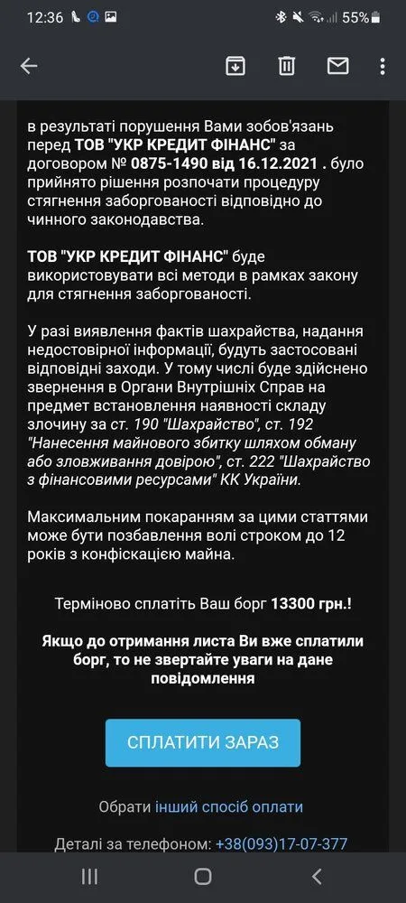 Vash BORG pered TOV UKR CREDIT FINANCE 01.02.2022 peredano do kolektorskoyi kompaniyi TOV Debtfort(EDRPOU 40298050; Kyiv,01034,vul Prorizna, bud.11, ofis 1; 0800300162)