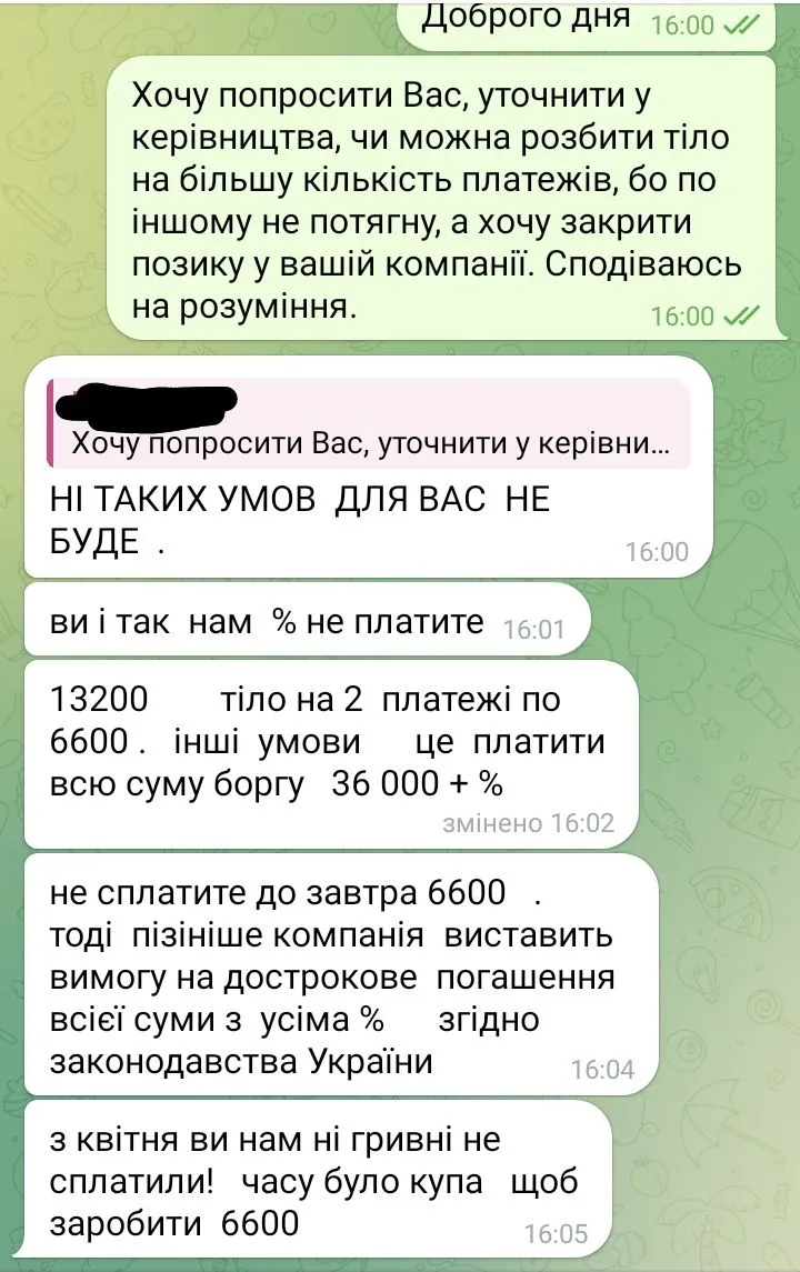 Я їм просто писала,що згодна оплатити тільки з розбивкою на платежі,вони хотіли однією сумою..і на пошту писала і в Вайбер ,десь через неділю після цього погодили.