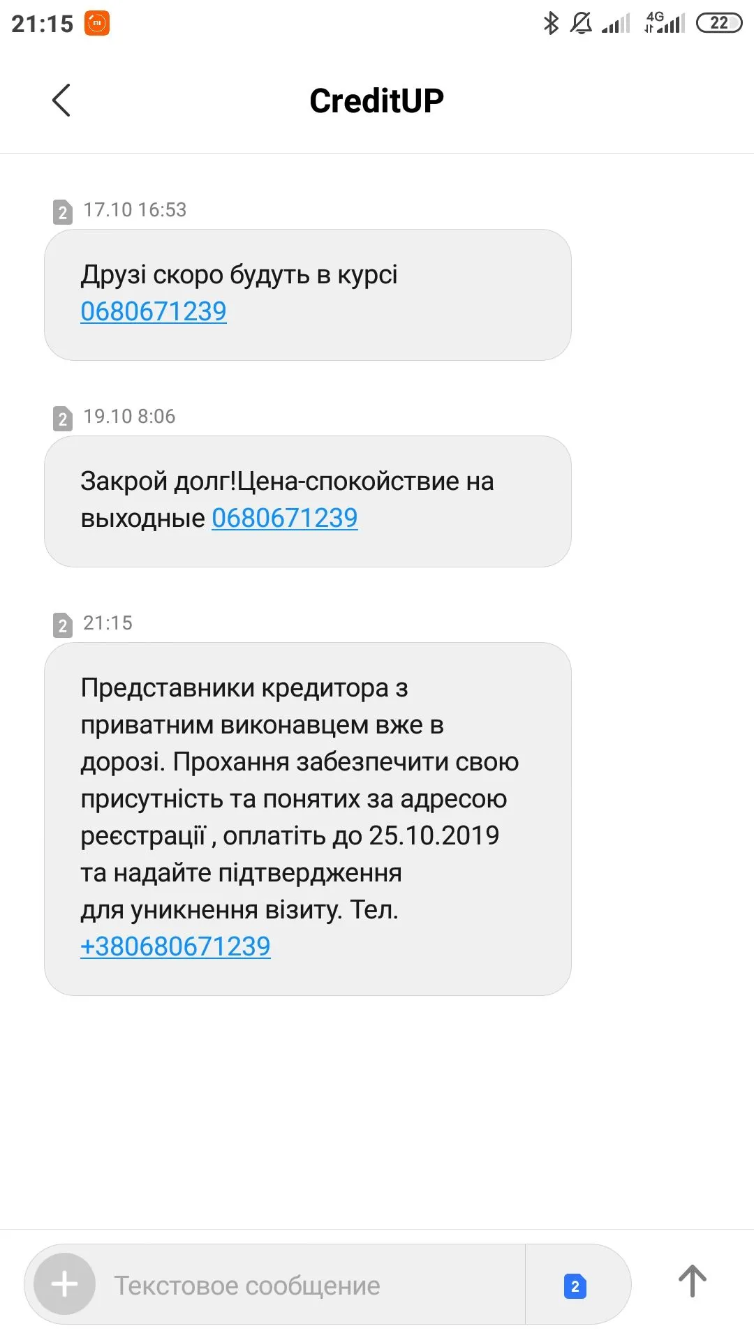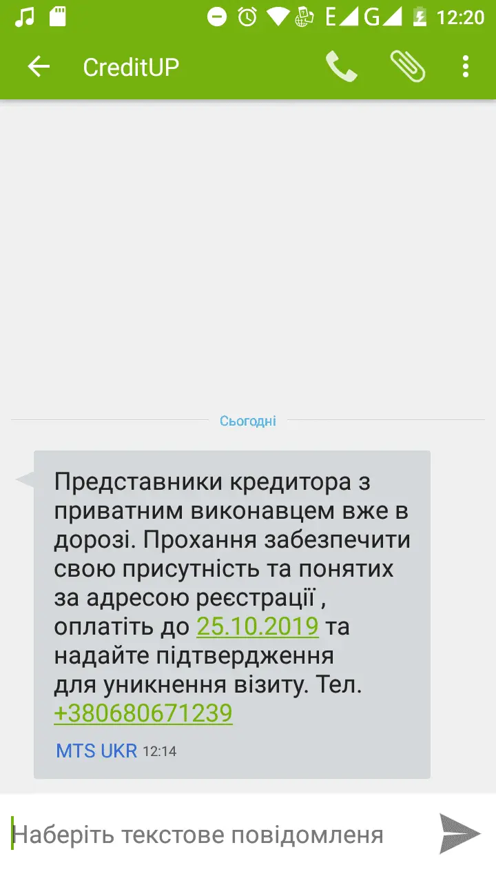 Сегодня пришла смс: "Представники кредитора з приватним виконавцем вже в дорозы. Прохання забезпечити свою пристуність та понятих за адресою реєстрації, оплатіть до 25.10.2019 та надайте підтвердження для уникнення візиту". Все бы ничего, но у них в договоре есть пунктик: