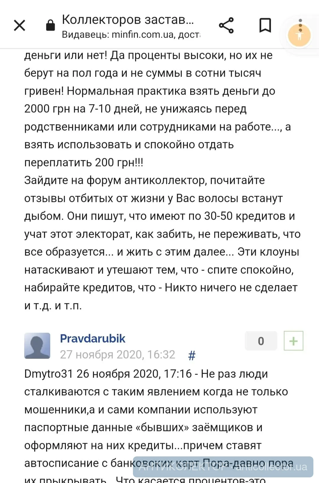Таня,дивись на що натрапила,стаття на Мінфіні про антиколекторский закон чи обмеження їх дій,точно не пам'ятаю.. стаття не свіжа,але коментарі про форум мене насмішили)напевно хтось із кредитних експертів написав в поганому настрої..ми, значіть,електорат)