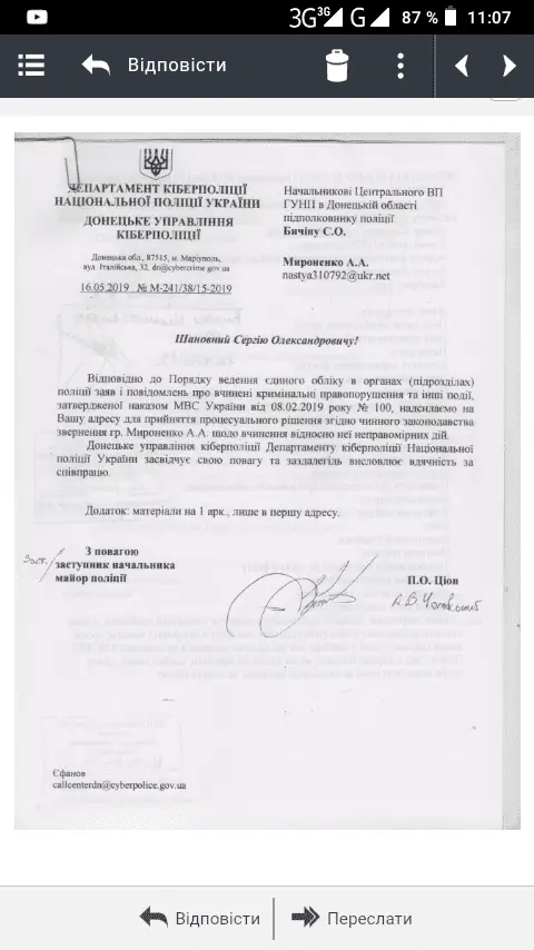 Передали у відділ поліції за місцем проживання. Але ж знову особисті дані не приховані...А как вы увидели что открыто мне пришло письмо на почту вот такое не могу понять что оно значит
