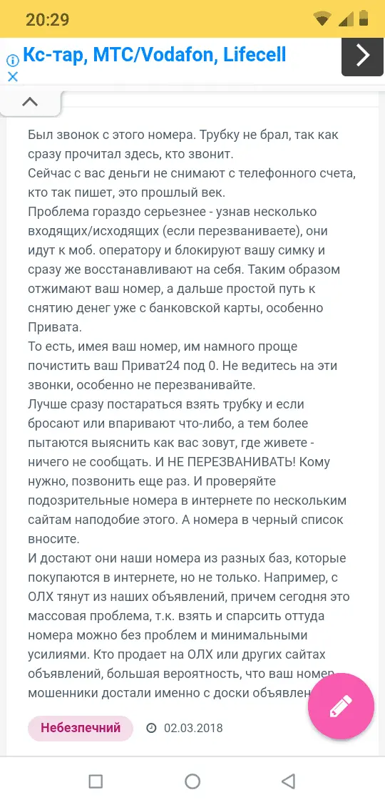 У меня уже пытались вскрыть Приват24. На работе слышу 3 смс подряд, а там " введите этот пароль для авторизации", звоню на 3700, оператор говорит, просто никому пароль не передавайте. И всё. На мои вопросы, как попугай, то же самое говорит, я аж трубку бросила. Приват перезванивает через минуту и спрашивает , оцените услуги оператора, аж злость взяла.