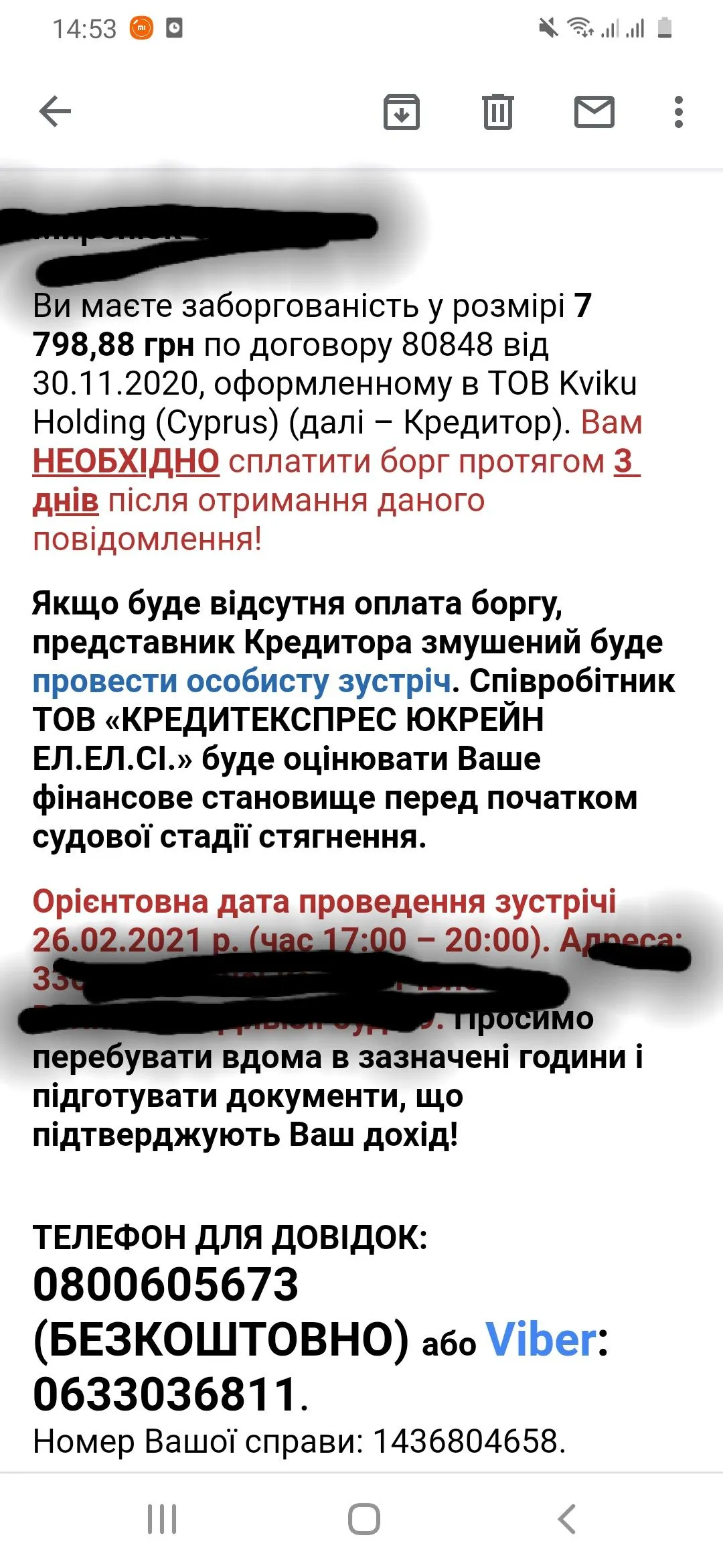 Доброго дня!Отримала лист..Прикріпила до теми..хтось подібне отримував?Пугалка чи як?Сам факт , що адресу куди приїдуть сказали не мою по місцю прописки , а колишнього чоловіка..що дивно та і він ніколи не казав , що хтось до нього дзвонив...дивно де взяли взагалі..Борг по Kviku де взагалі мізер інформації