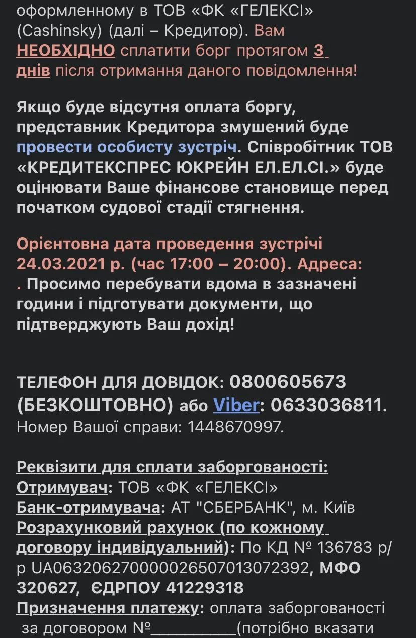 так самое странное , что потом была смс- Ваш борг перед ТОВ ФК ГЕЛЕКСI передано CreditExpress. У вас 4 години для боргу! № квитанцii повiдомте за тел 0800605673, но я у Футбольного Клуба кредит не брала, а если серьезно, я так понимаю ФК ГЕЛЕКСI, это и есть Cashinsky