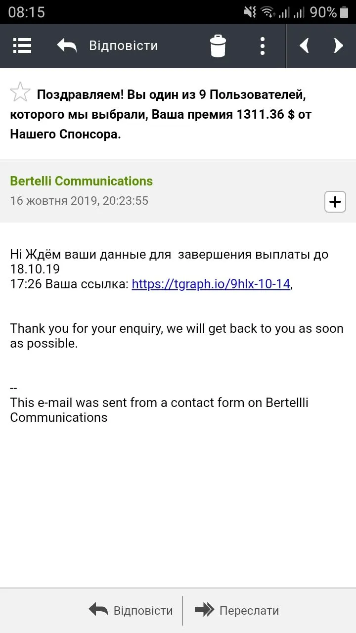 По тел.видила,людям пришло сообщения что на ихнию карту переведенны большая сумма денег,и тоже переходите по сылке,девушка перешла ,и с привата украли 20000гр.Как незнаю.Но идет раследование),и она такая не одна.