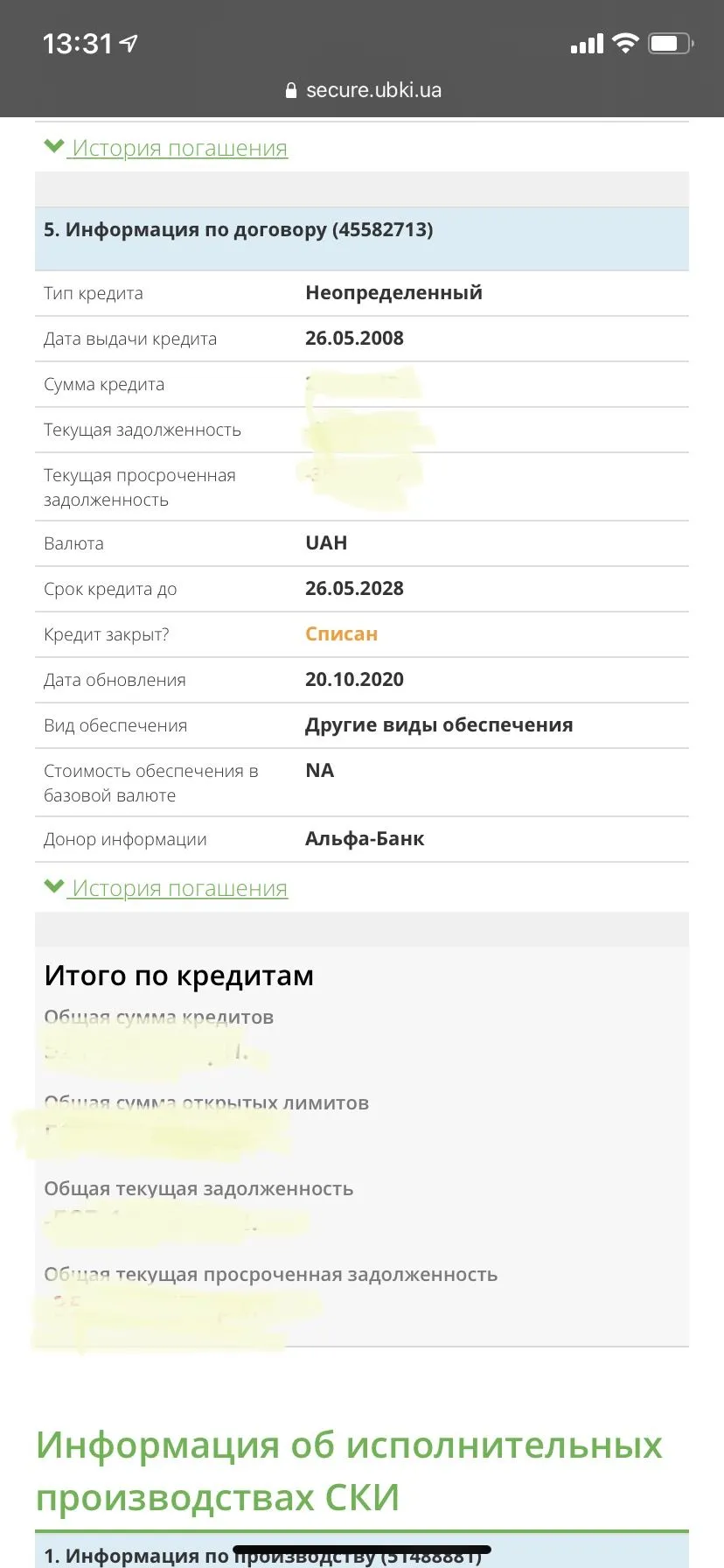 Недавно установила программу ДІЯ и увидела виконавче впровадження, которое было открыло в 2016 году и закрыто в 2018. По УБКИ кредит списан, но в приложении Альфа банка кредит есть, и сумма уже наросла в два раза. Как узнать точно если кредит списан - банк должен его у себя на счетах тоже списать? Если исполнительное производство закрыто - что это значит? В общем каким образом можно разобраться с этим кредитом? Мне нужна помощь чтобы грамотно составить обращение в банк? Для информации: