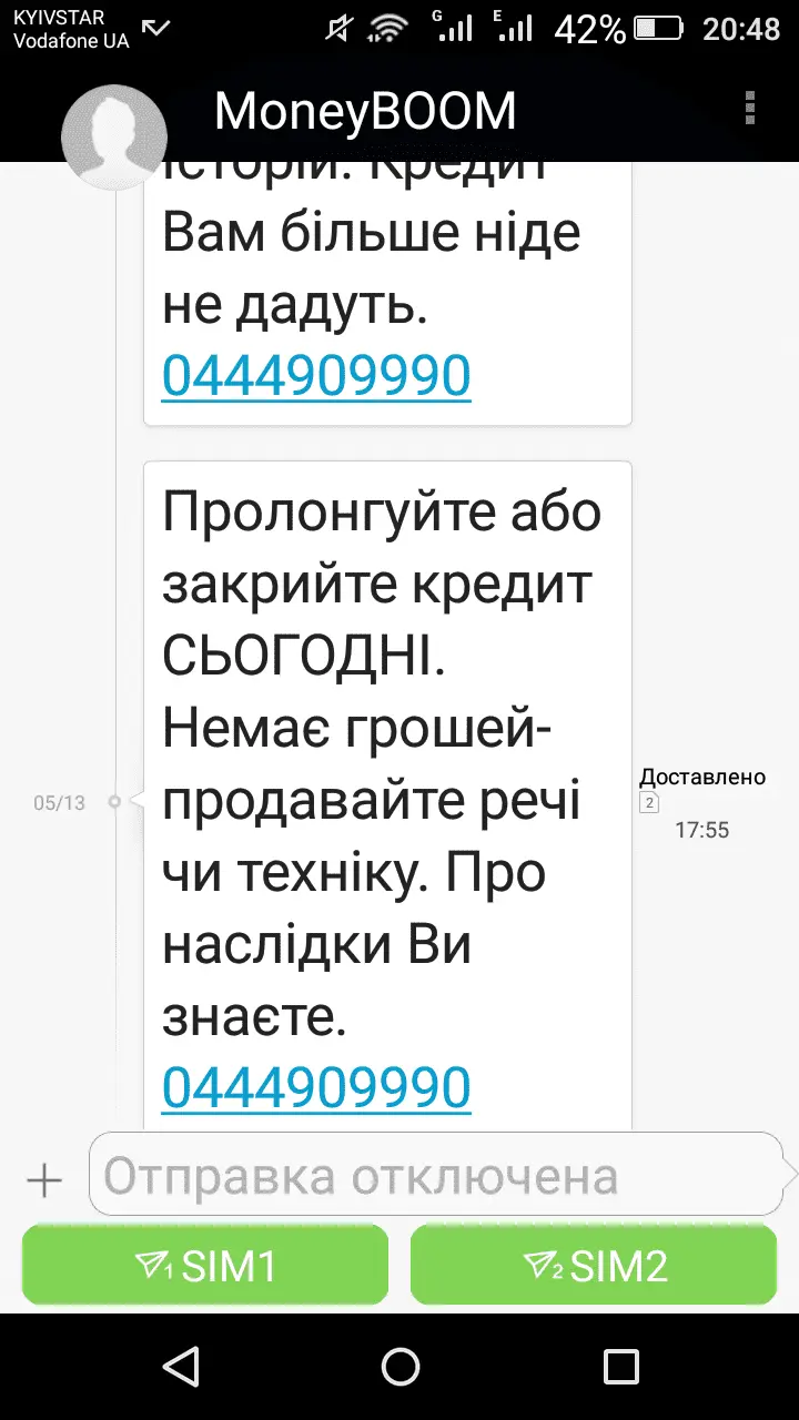 Хто що мав із ними, підкажіть? Взяв кредит 7к, не перший раз, але пішла прострочка, вліпили 25 тисяч їм віддати, таких грошей віддавати нема та і не буду!!! Дзвонить неадекват, погрожує, говорить різну фігню, співає гімн росії і каже що з ЛНР, мало того, дзвонять до кума і тестя, номера їх я в анкеті не давав, але де вони їх взяли? Моряльний тиск сильний, де-коли смішно, а буває вже хоч мило і шнурок готуй. Що робити і хто мав із ними справу, що їм казати по телефону щоб хоч трохи схаменулись?