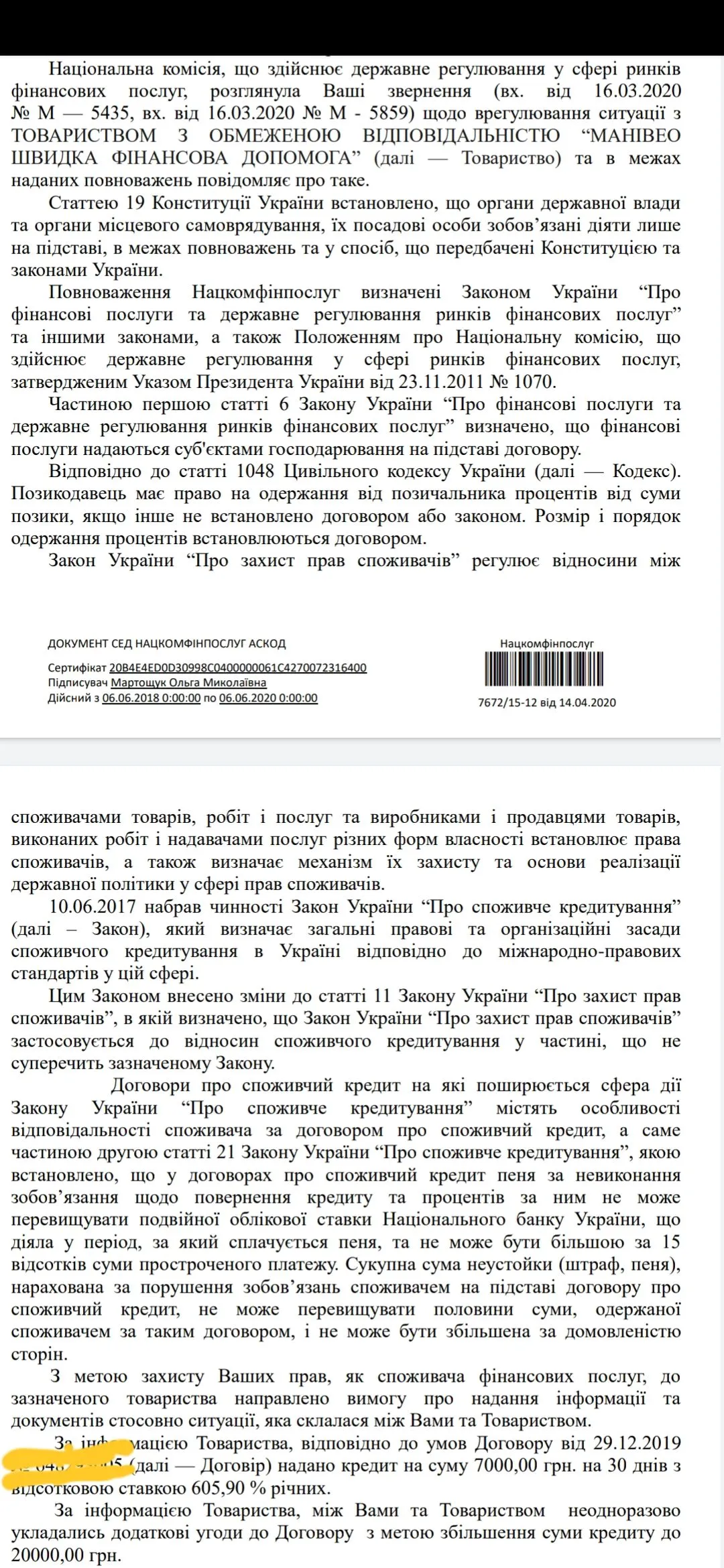 Брала я в манівео 5 тис. Потім збільшили ліміт. Дали 7 тис. За місяць прострочки нарахували 43 000. Після дзвінка списали до 37 000. Батьки заплатили ці гроші. Не змогла я переконати що не варто. Про це дуже шкодую.