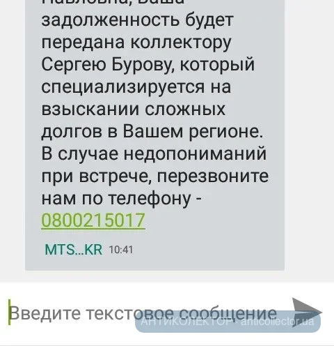 Добрый вечер пришло сегодня смс от Талона кто знает этого персонажа что дальше будет , Ваша задолженность будет передана коллектору Сергею Бурову, который специализируется на взыскании сложных долгов в Вашем регионе. В случае недопониманий при встрече, перезвоните нам по телефону - 0800215017