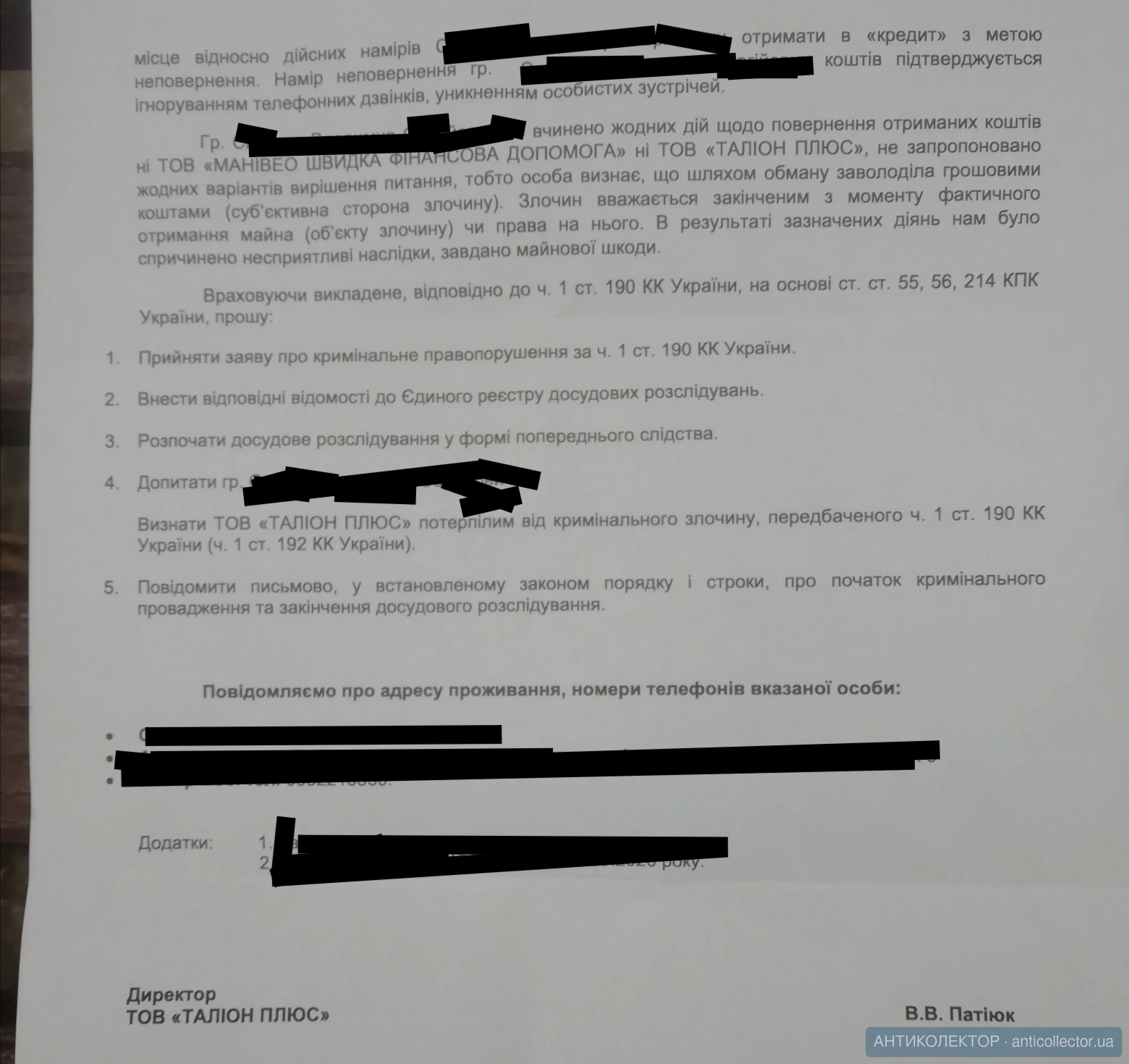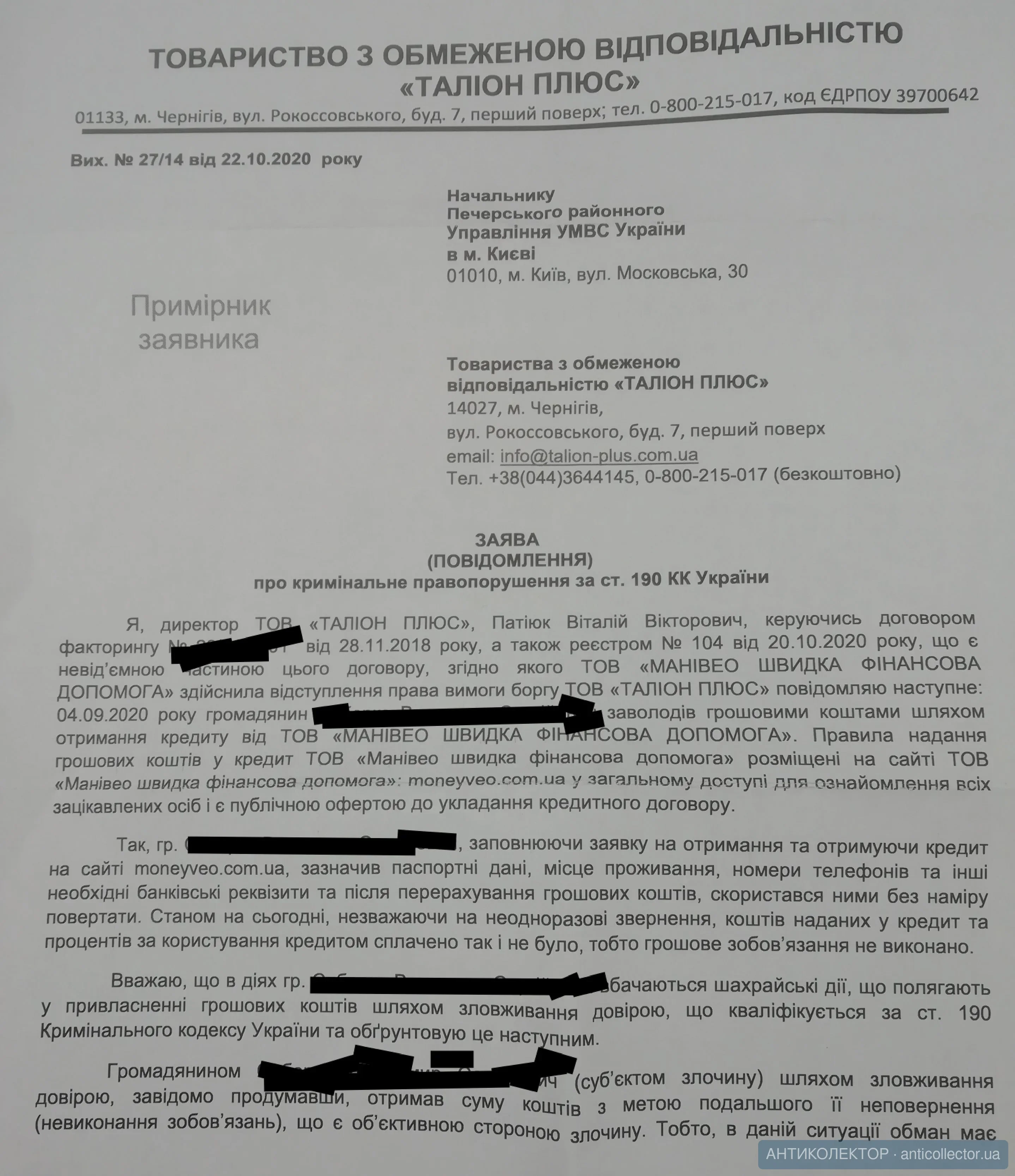 Ещё раз всем доброго времени суток. Взяв информацию с форума и интернета, хочу лично для себя поставить точку. Опишу ещё раз ситуацию в определённый момент сложилась ситуацию что срочно нужны были деньги, кредитная история была чистая и нулевая нигде и никогда не брал займы и кредиты. Но поситуации пришлось прибегнуть к этому, почитав информацию мой выбор упал на маниево, взял первый займ погасил в срок, спустя какое то время был второй займ, тоже погасил в срок. Потом взял ещё раз и все сводилось к тому что я его как и прошлые оплачу в срок и забуду всю это историю с займами в мфо, но ситуация скажем так поставила подножку и попал под сокращение на работе, думал ну попал и попал будет зп с неё отдам долг, но на работе сказали что зп отдадут в следующем месяце, я пошевелил мозгами и решил взять ситуацию в свои руки сразу написал на маниево что не уклоняюсь от уплаты долго но возникла такая ситуация, мне ответили что меня наберет якобы менеджер который работает по моей задолженности, он не заставил ждать себя и набрал меня, мы обсудили с ним ситуацию и пришли к выводу что они подождут моей уплаты но проценты будут капать, потом ещё разговор и ещё разговор с другими менеджерами которые все в один голос говорили, да хорошо фирма ожидает вашу оплату, и спустя неделю получаю смс что меня продали талион плюс, я опять взяв ситуацию в своои руки решил им набрать и поговорить, на контакт со мной вышел якобы человек который представился главным юристом компании талион плюс, я сразу сказал ему что наша беседа под записью, он. Сказал хорошо, и мы начали вести диалог он мне рассказывал про суды, выездные группы и все такое и сказал что в случае не уплаты сегодня сума возрастёт в 2раза, но при оплате будет письмо гарантийное на ел. Почту и на почту адреса прописки, я сказал что подумаю, паралельно он сказал что они отдельная компания которая не имеет никакого отношения к манивео они просто выкупили договор, но в разговоре он сказал что знает когда и сколько раз я заходил в личный кабинет манивео, я этот мемоент взял на заметку, дальше вечером он начали обзвон по родным и смс слать насколько я понимаю по УК они не имеют права этого делать елси номер небыл указан как контактный, дальше пришло письмо на почту адреса проживания что подают на меня в суд. Исходя из информации которую я получил на я понял что 190 статья это бред что они угрожают, плюс они не могут даказать факт умышленой неуплпты ибо я и в разговорной форме и в письменной говорил что не ухожу от уплаты данного долга. По завершению всего лично для себя хочу понять как действовать дальше, что бы эта мысль не сидела в голове и не отвлекала меня. Заранее благодарен за все ответы и советы.