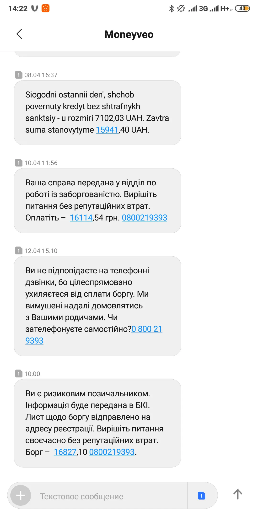 13тис а через три дня було до 50тисяч.я заплатила.а потим в цю опу влизла знову.бо боялася ридним сказать,а коли сказала дак вже 13мфоНехай пишуть я в них колись брала крелит не памятаю на яку суму.год робила пролонгации.дак цей кредит я им прощаю.отдам тильки через суд