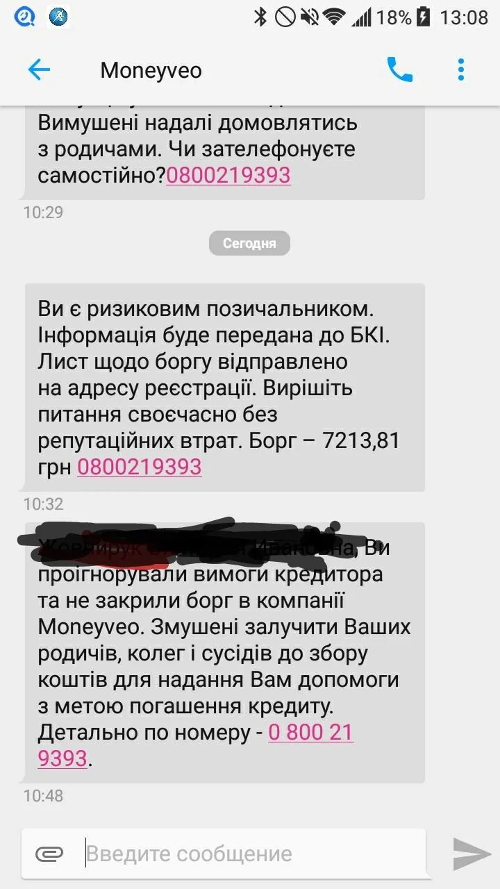 По всем данным уже пошла просрочка от 3х дней и более ( до 2х недель). Террор звонками ( антиспам, спасибо огромное))!! смс и уведомления в вайбере, что передают третьим лицам, пишут список имён ( судя по всему взяты из ВК, взломали, т.к был закрыт и давно не появлялась там!).